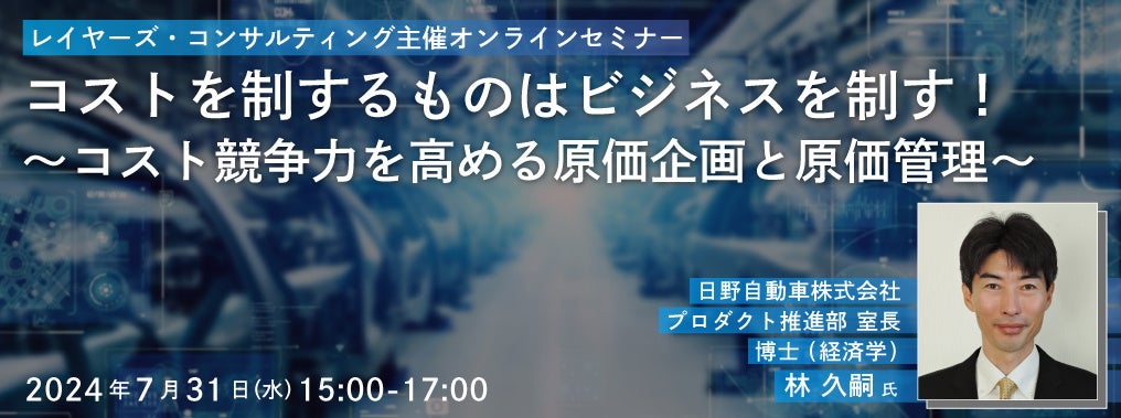 株式会社レイヤーズ・コンサルティング(東京都品川区、代表取締役CEO:杉野 尚志、以下:レイヤーズ)は、オンラインセミナー『コストを制するものはビジネスを制す!~コスト競争力を高める原価企画と原価管理~』を2024年7月31日(水)に開催することを発表いたします。