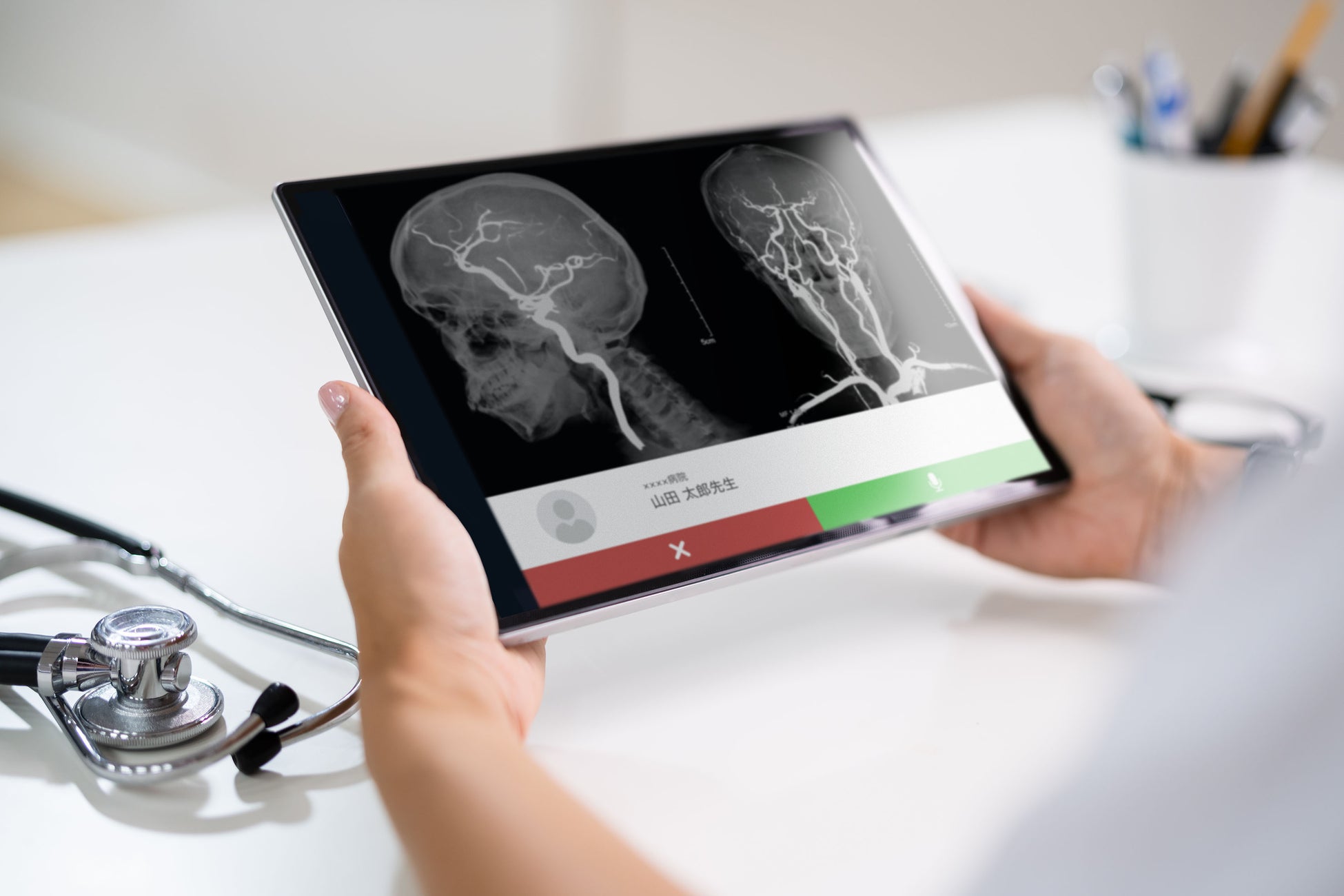 ハート・オーガナイゼーション社と協力させていただき、当院にてCaselineを脳卒中診療に初応用いたしました。会話しながら電子カルテやアンギオ装置、ワークステーションの画像をリアルタイムに確認出来るため、上級医が自宅にいながら画像を確認したり、血管内治療を指導することが出来ます。画面上に線画を自由に描くことができるため、病変部位などの関心領域を指摘するのに非常に便利です。