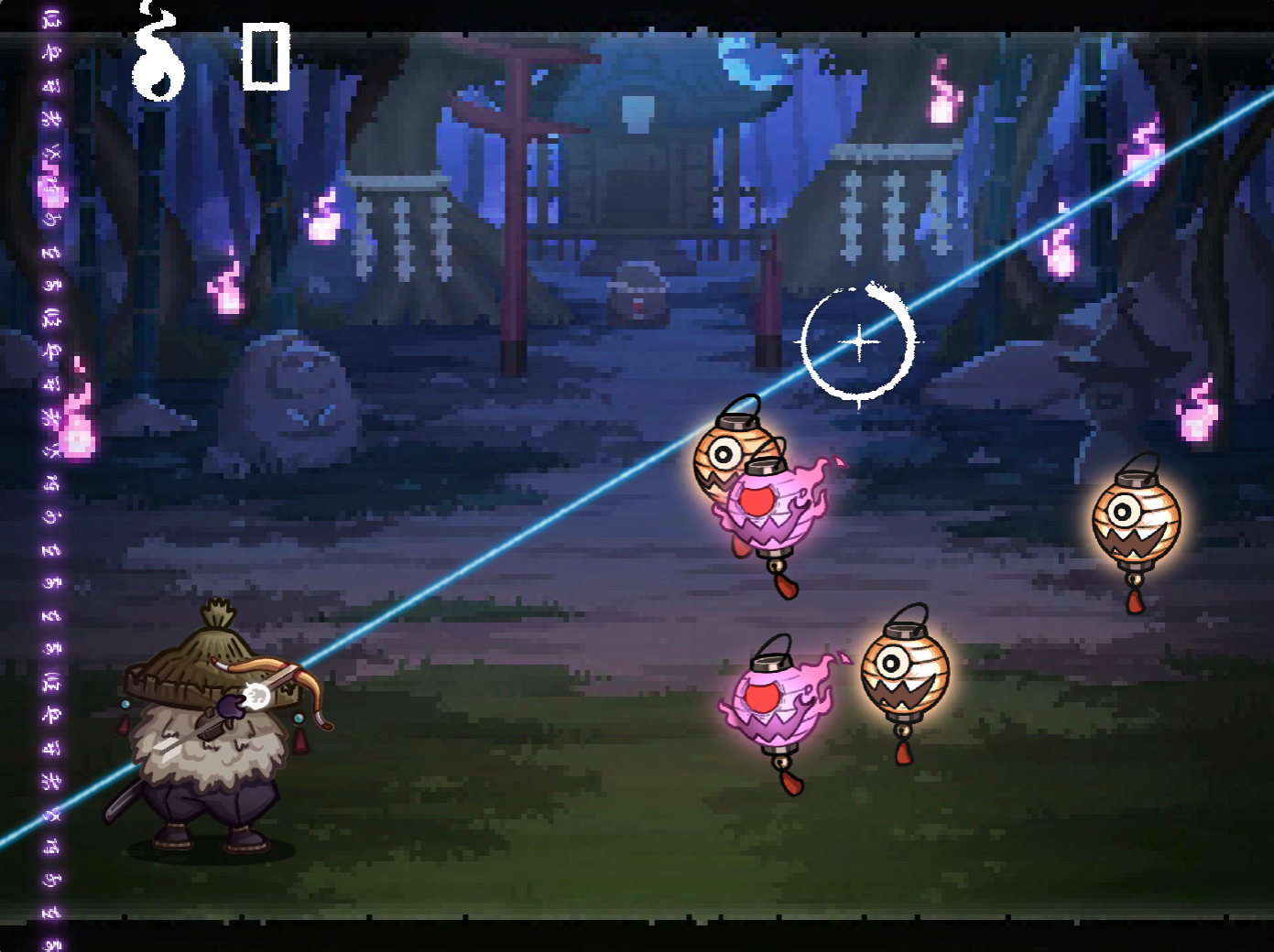 画面の右側から迫ってくる提灯お化けが左側にある村に入らないように撃ち落とそう! パワーをためて鋭い一撃が放てる「チャージアロー」や、一発逆転の「パリィ」のスキルを駆使して高得点を目指そう!