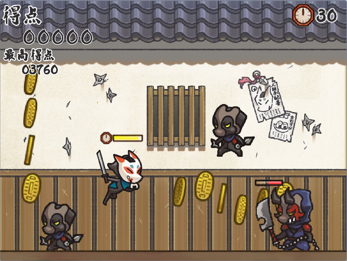 画面の右側に走り続けるキャラクターを操って小判を集めよう!「スラッシュ」のスキルで敵キャラクターを倒せば、制限時間を延ばすアイテムが手に入る!ピンチの時は「スロウ」を発動して逆転しよう!