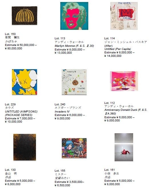 また国内作家については、草間彌生の1993年のキャンヴァス作品「かぼちゃ」や、セールカタログの表紙を飾る金山明の先鋭的な作品をはじめ、マーケットで注目を集める作家の作品が多く揃います。東京のアートシーンが華やかに彩られる季節に、特別なオークション体験をお楽しみください。