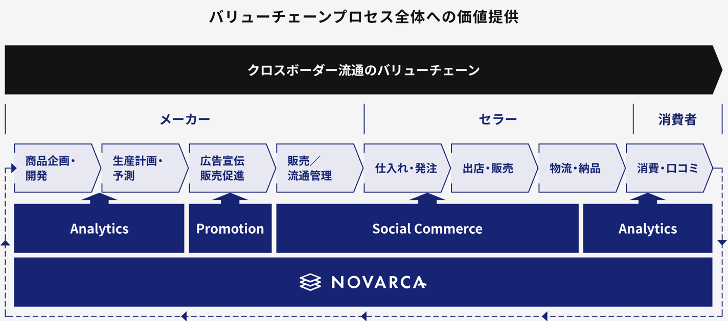 NOVARCAは、日本経済の活性化にむけた外需の取り込みを図るべく、祖業であるデータ解析の技術を軸にした越境ビジネスプラットフォーム事業を通じて、日本企業のグローバルビジネスを支援してまいります。