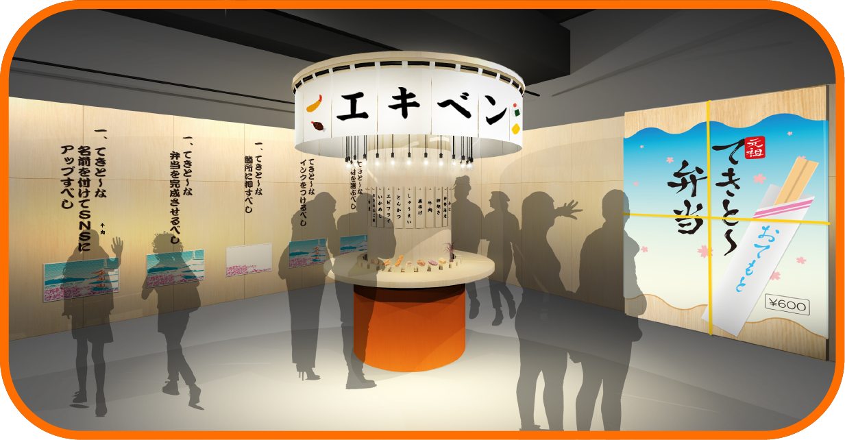 駅さながらのデザインが施された券売機でチケットを受け取って改札を通り入場すると、約1,000m²もの敷地内には、“てきと〜”を楽しめるよう創られたコンテンツが詰め込まれています。来場者は、全⻑42.5mにもなる「てきと〜線」というぐにゃぐにゃの車両から、「てきと〜中央駅」、「エキベン・タウン駅」、 「メチャコミ・スクエア駅」、「てつど〜ぶつパーク駅」、そして「ゲーム・ステーション駅」という主に5つの「てきと〜」で楽しい駅(エリア)を各々下車しながら、体験型テーマパークを楽しみます。