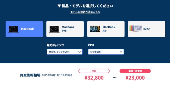 買取に出したいMacBookの「モデル・年式・容量」を選択するだけで、中古・新品の査定相場がリアルタイムで表示されます。