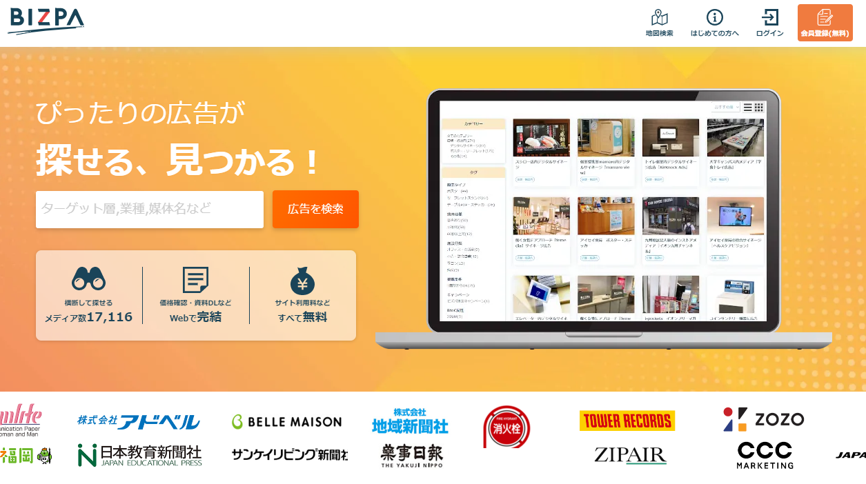 当社は「広告業界をアップデートする」をミッションに、広告メディアの検索プラットフォーム「BIZPA(ビズパ)」を2020年8月より正式運営しています。ビズパには看板・デジタルサイネージ・紙媒体・交通広告・WEB広告など17,000以上の広告メディアが掲載されています。予算・ターゲット・最寄駅・地図など様々な条件で検索でき、自社に最適な広告を効率的に探すことができます。商品の特徴・価格・属性のグラフなどWEBから確認でき、見本誌・媒体資料などもダウンロード可能。ビズパを通じて媒体社との直接取り引きができ、適正な価格での取引や小ロットでの取引が可能です。