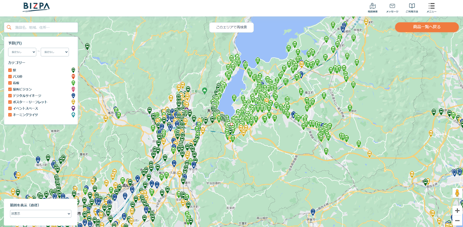 広告主はビズパのサイト上で、市区町村名や駅名での検索や、地図上から広告媒体を探せる機能を使い、かんたんに看板広告の場所や価格、周辺の写真といったデータを閲覧することができます。