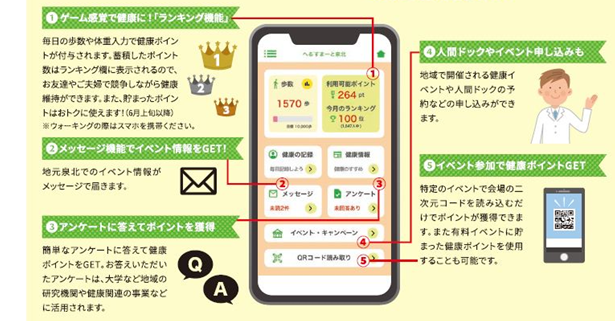 - ヘルスケアアプリ「へるすまーと泉北」の主な機能と特徴
