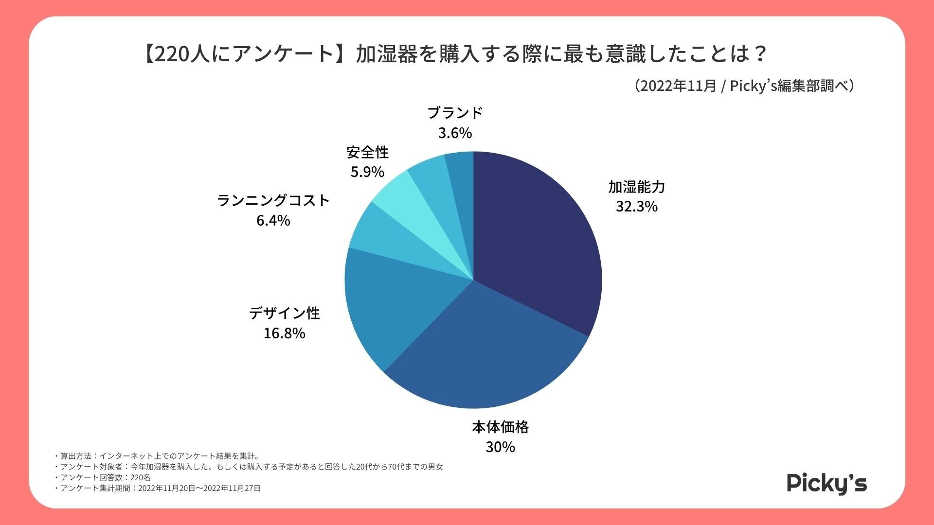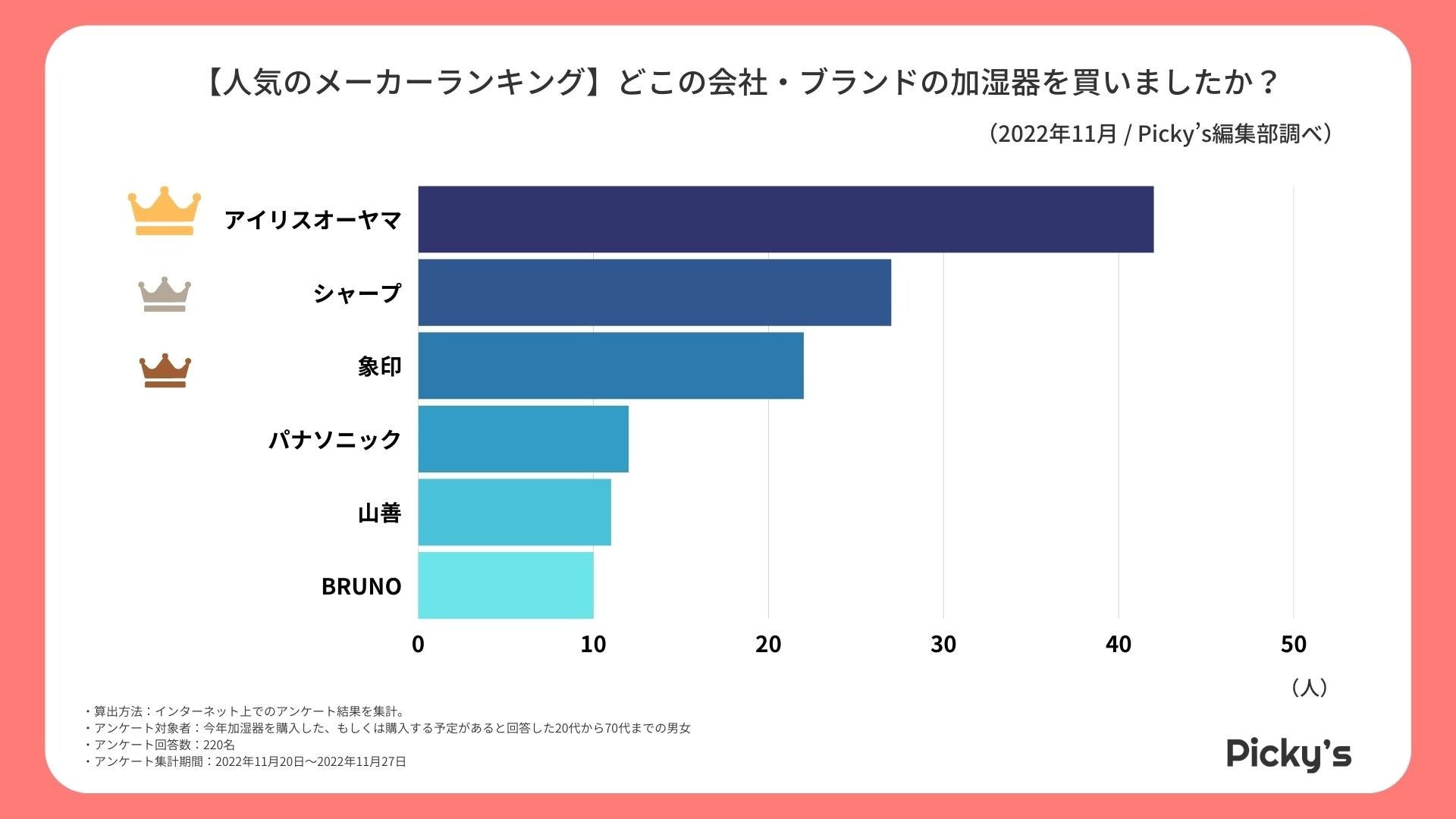 「Picky’s」は、インターネットショッピングにおいて、購入前に試せない・選ぶべきものがわからないという課題の解決を目標に、あらゆる商品のおすすめランキングや検証レビューを紹介するサイトです。このたびPicky’s(https://rentry.jp/note/)では、加湿器を買う際に意識していることや人気のメーカー・ブランドなどをインターネット上でアンケート調査を行い、ランキングを作成いたしましたので発表いたします。