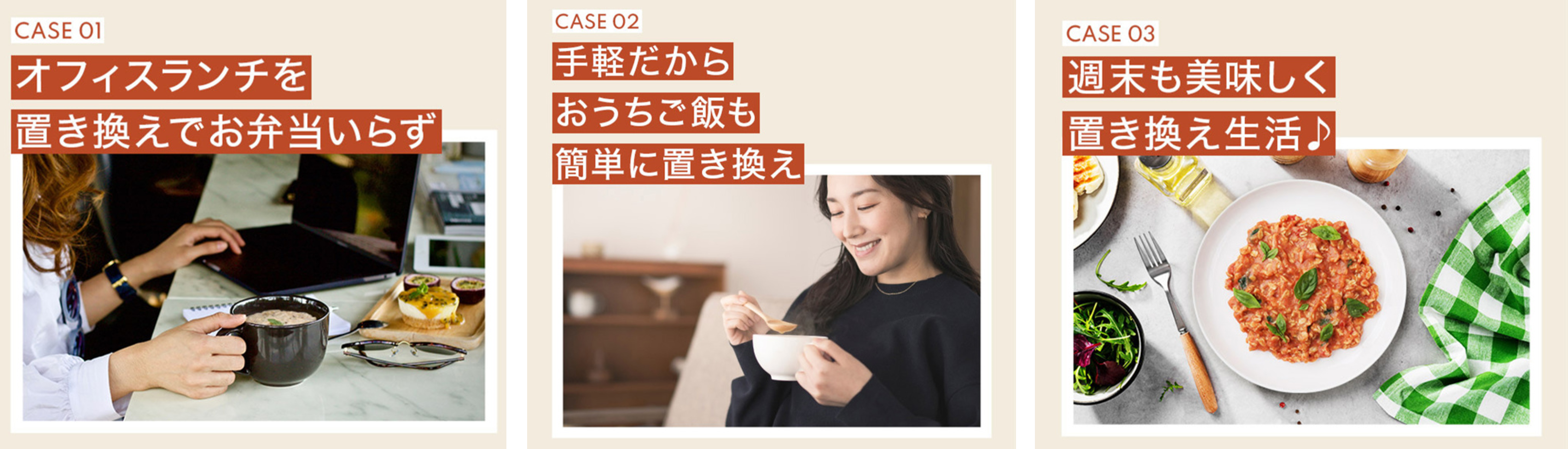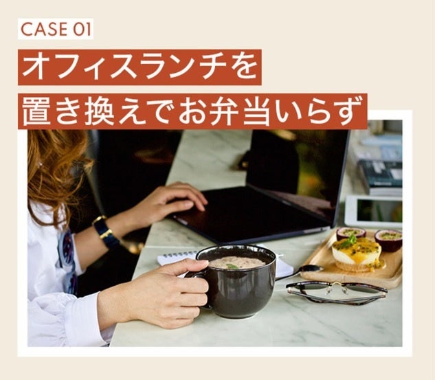 自然な甘みと酸味を感じるトマトリゾット、コクとまろやかな味わいのキノコクリームリゾット、2つの味わいをお客様の気分に合わせて選びながら、飽きずに美味しく、楽しく、置き換えダイエットが続けて頂けます。