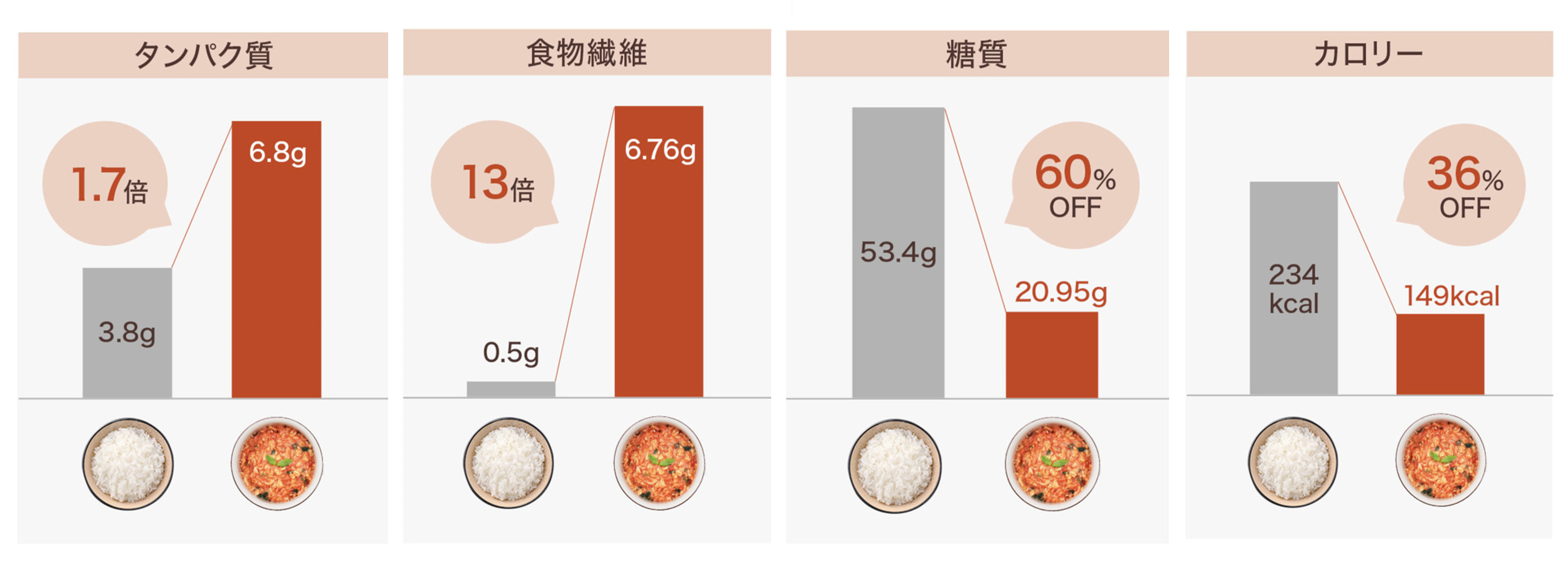 一方で、食事の際に気になる糖質やカロリーについては、1食263gという食べ応えを実現しながらも、糖質20.95g(※2)、カロリー149kcal(※2)でしっかりと抑えています。