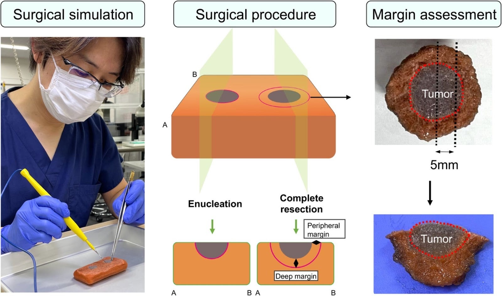 名古屋大学メディカルxRセンターにて電気メスを用い、腫瘍の取り残しの検証を行いました。腫瘍をぎりぎり切除する核出群と、周りの組織をつけて切除する完全切除群で比較したところ、核出術群では切除後に残存の蛍光強度が有意に高く、腫瘍の取り残しが証明されました。