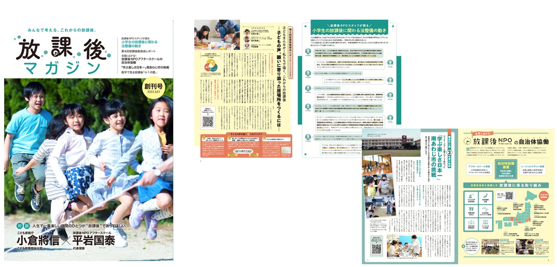 放課後NPOアフタースクールは法人化から14年間、地方自治体と連携して、放課後児童クラブ(学童保育)の待機児童問題、場所や担い手不足、活動のマンネリ化など、各地域の課題解決を目指し、地域ニーズに寄り添いながら、地域人財を活用した放課後づくりに携わってきました。各地の自治体担当者からは、「他地域の好事例を知る機会がなかなかない」という声をいただくことも多く、放課後事業に関わる担当者を主な対象に、国の施策、各地域の動向や好事例、専門家の声など情報発信強化の必要性を感じ、マガジン発行の運びとなりました。2023年度に年間3回冊子で発行し、以降はWEBメディアを中心に情報展開を予定しています。
