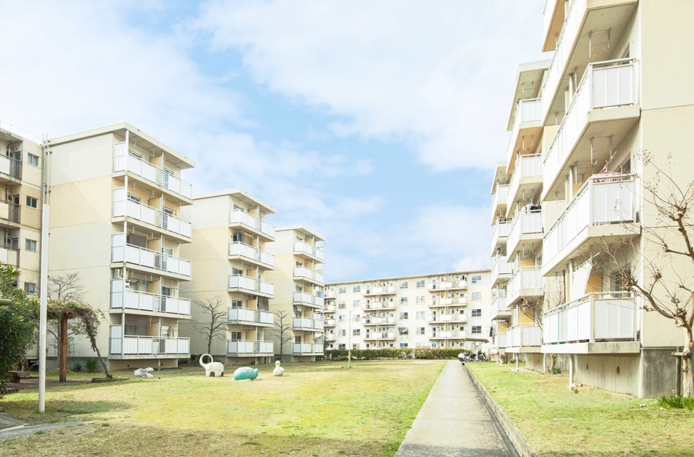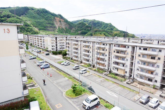 JR四條畷市駅よりバスで移動すること約11分。昭和46年に建設されたレトロな雰囲気の漂う集合住宅です。見晴らしの良い場所に位置しており、ベランダからの景色がとても魅力的です。現在は、入居者の半数以上が高齢者となっています。本事業は、団地に若者等が入居して自治会活動等に参加することで、コミュニティの活性化も図ります。