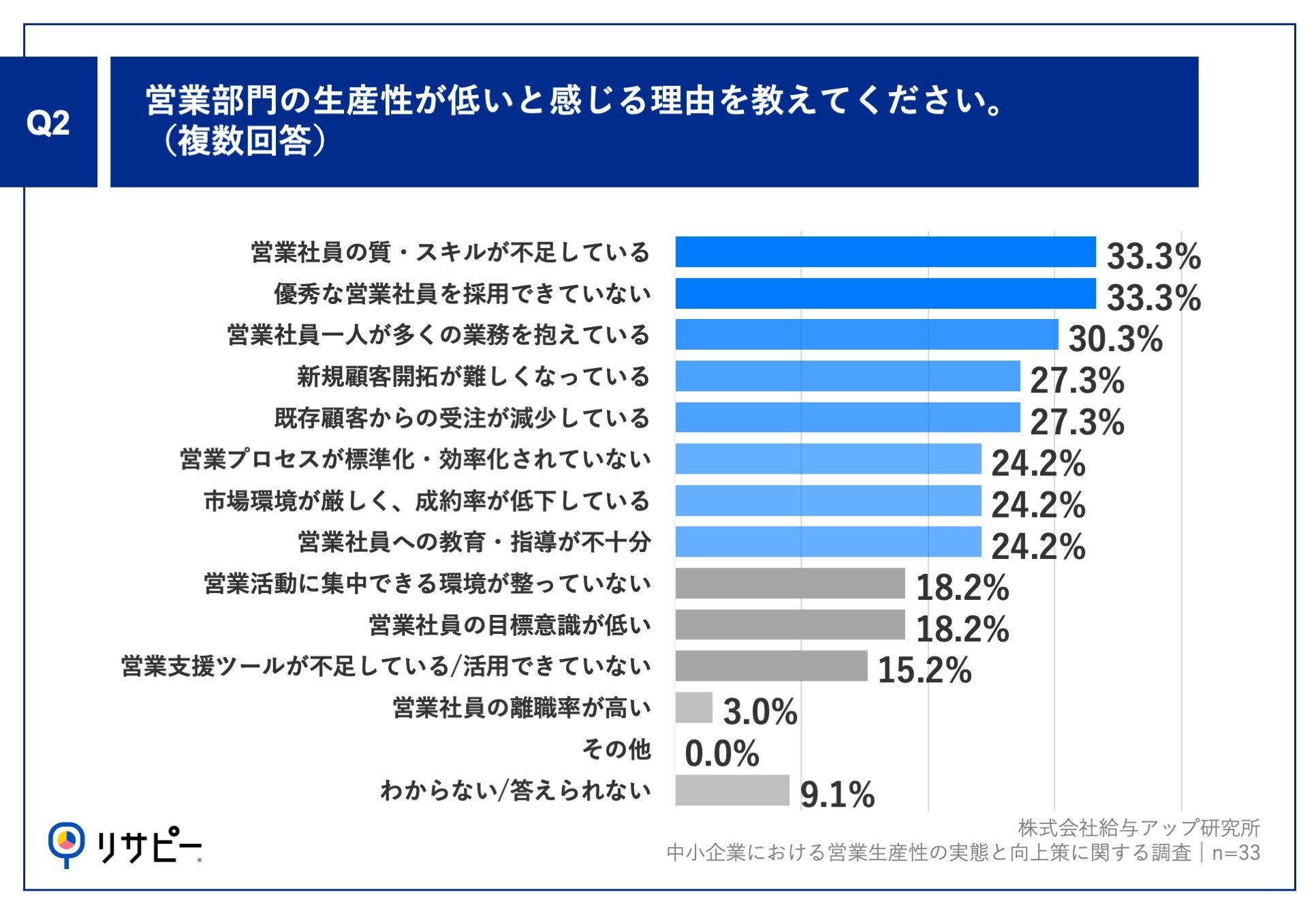Q2. Q1で「やや低いと感じている」「非常に低いと感じている」と回答した方は、営業部門の生産性が低いと感じる理由を教えてください。(複数回答)