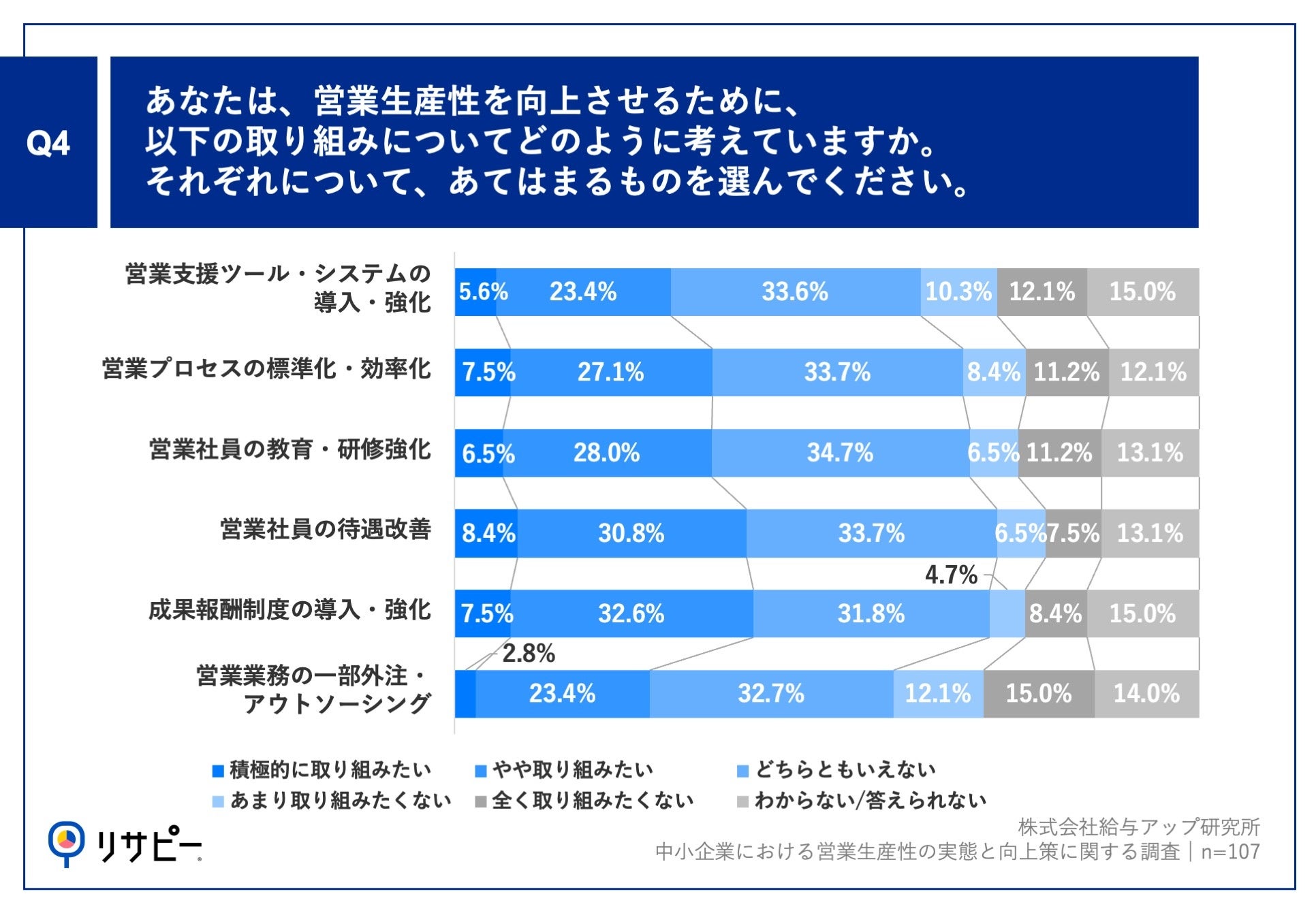 Q4. あなたは、営業生産性を向上させるために、以下の取り組みについてどのように考えていますか。それぞれについて、あてはまるものを選んでください。