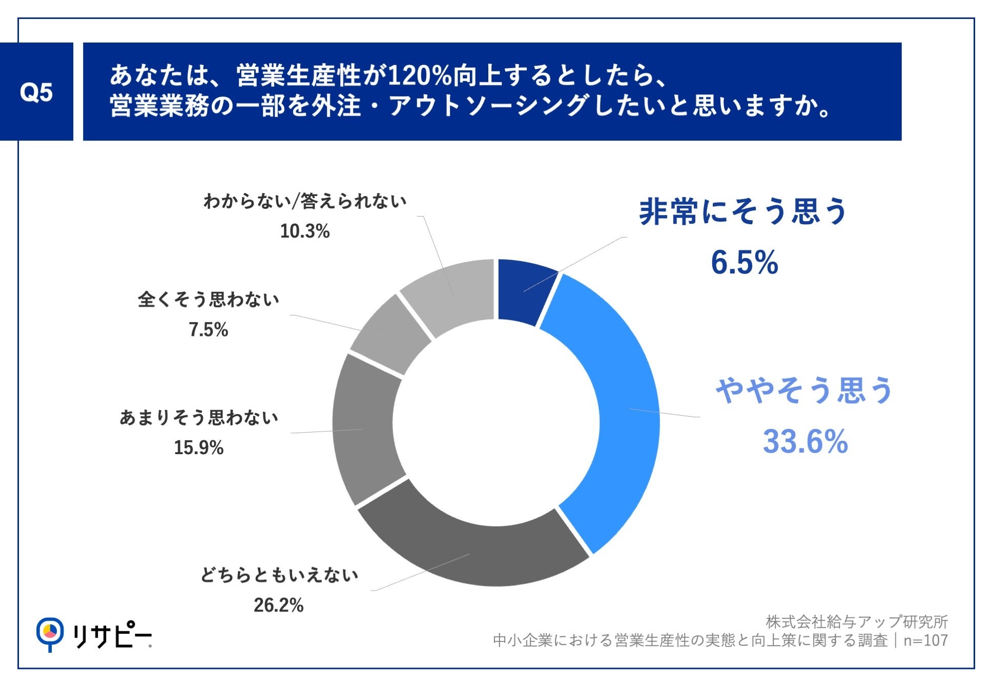 「非常にそう思う」が6.5%、「ややそう思う」が33.6%という結果が出ました。「営業業務の一部を外注・アウトソーシングしたい」と考える方が、全体の40.1%ほどであることがわかりました。