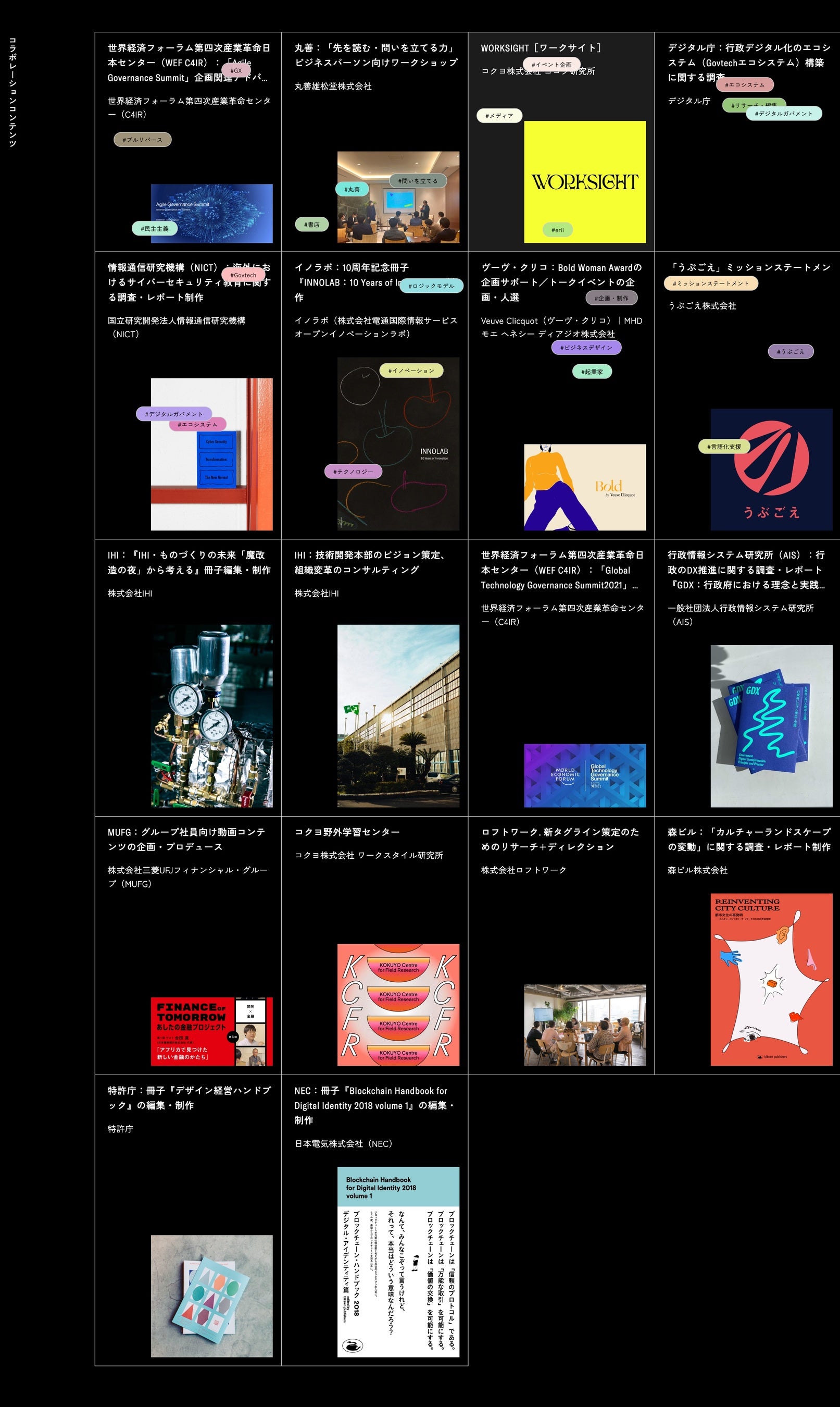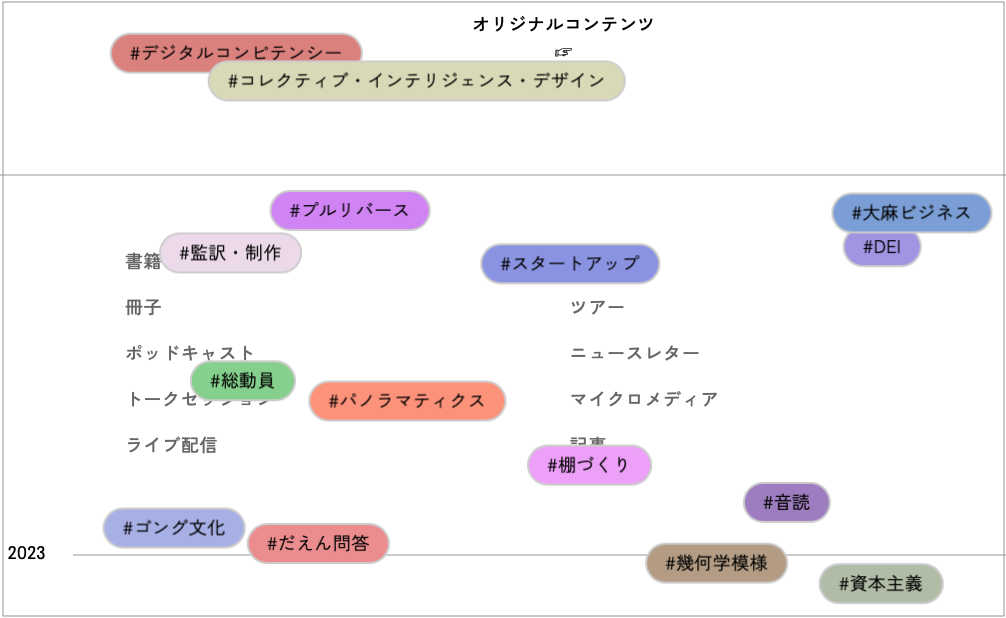 刊行のたびに話題を呼んだ『NEXT GENERATION GOVERNMENT 次世代ガバメント』『働くことの人類学【活字版】』『週刊だえん問答』などの書籍をはじめ、累計視聴回数100万回以上の人気番組「こんにちは未来」や「メタバースえとせとら」などのポッドキャスト、年間30本以上実施している各種イベント、サイバーセキュリティや行政DXに関する調査・レポート制作など、制作実績は多岐にわたります。