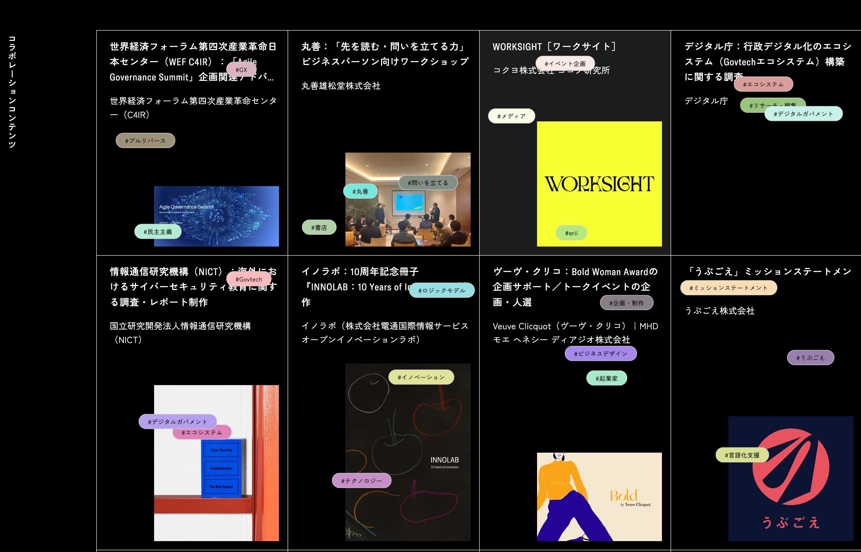 「Collaboration」のタブからは、クライアント企業向けのソリューションと各種事例をご紹介しています。冊子の制作やイベントの企画・運営、調査からコンサルティングまで、編集力とネットワークを駆使したソリューションをご提供しています。クライアントやコラボレーターと一緒に考え、議論しながらつくり上げていくコンテンツ制作の背景もぜひご覧ください。