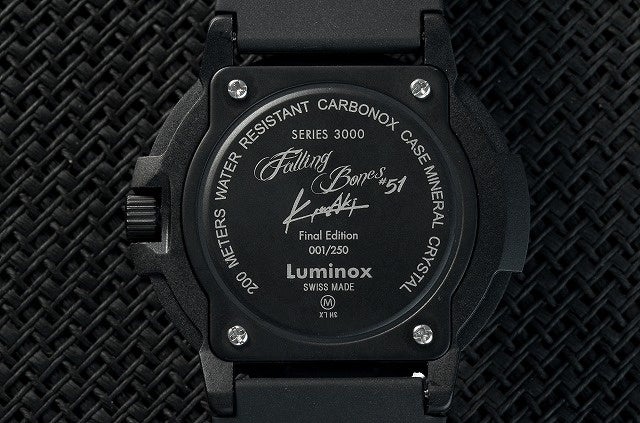 シリアルナンバーも記載されており、特別な1本であることを主張。時と場所を選ばずに着用できる万能デザインが◎ルミノックスの永久アンバサダーとも言える岩城滉―氏が昨年の3月21日に70才を迎え、古希を祝福する意味でもリリースとなったのが同氏率いるフォーリングボーンズとの最終別注モデル。