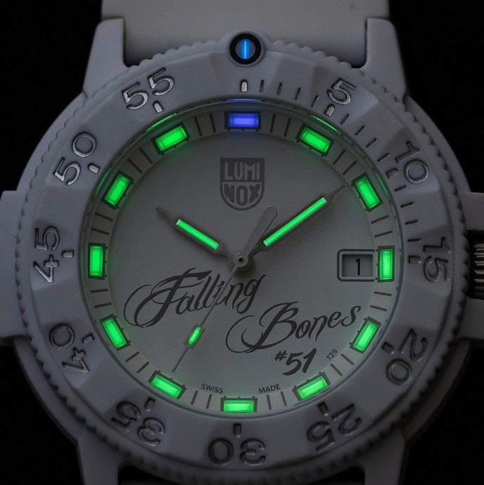 ダイアルに配したバーインデックスはシンプルながら「LLT」により夜間も計時可能。「#51」はKOUICHI と1951年生まれに由来。フォーリングボーンズのロゴに加え、裏蓋には岩城氏のサインデザインが刻印。