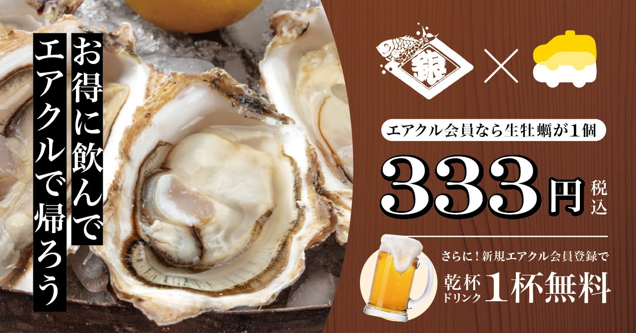 【お得に飲んで、エアクルで帰ろう】銀次グループ全店舗にて旬の生牡蠣を大幅割引!さらに新規会員は乾杯ドリンク1杯無料!
