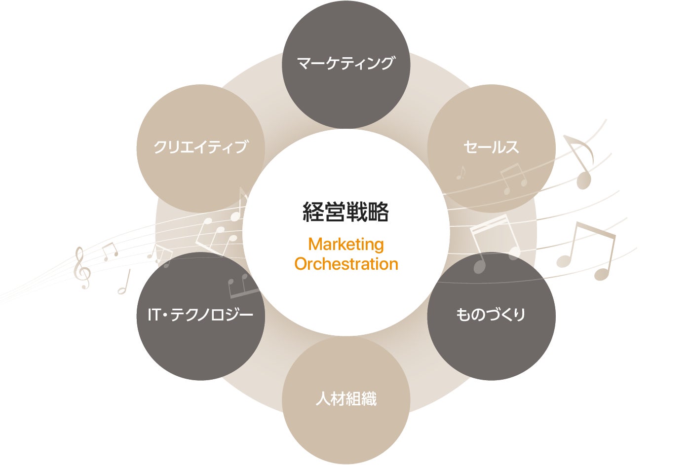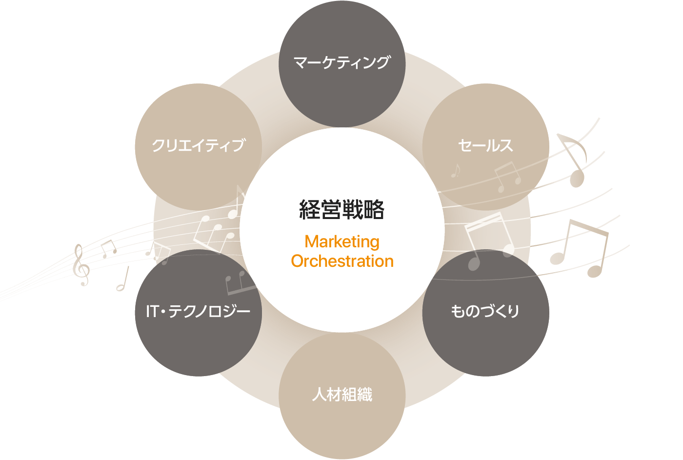 研究・開発、設計、生産技術などのものづくりから、ブランディング、デマンド、そしてセールスや販売代理店のマネジメント、海外の現地法人やその代理店までの全てのマーケティング&セールス活動を全体最適で調和連繋させ、最良のハーモニーを奏でる事を指しています。