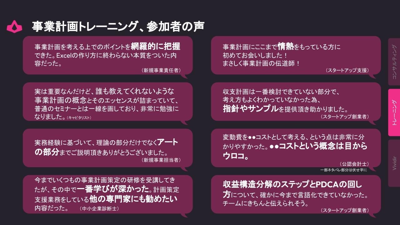 新規事業では、不確定要素を考慮し、事業計画をタイムリーに更新し、質の高い意思決定が求められます。プロフィナンスが提供するVividirは、このような状況での意思決定をサポートするため、研修やセミナーで培ったノウハウを盛り込んでいます。
