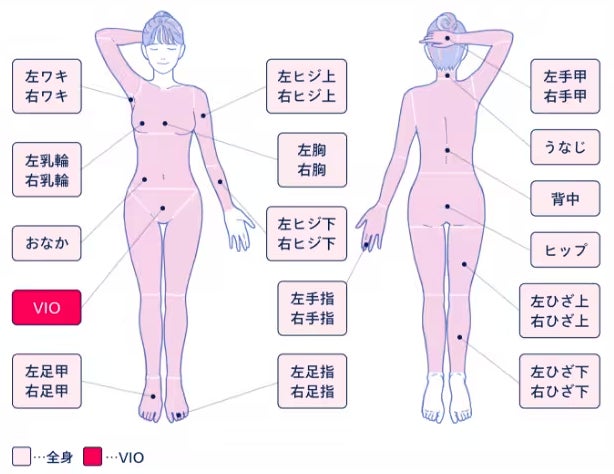 医療脱毛をもっと手軽な金額で始めたい方に向けて、全身+VIO5回コースを月々2,300円〜(※)ご用意しました。全身+VIOの施術箇所は全部で29箇所。1箇所1回あたり約1,030円で医療脱毛が可能です。また1回の施術時間は60分で完了。隙間時間で手軽に脱毛が可能です。