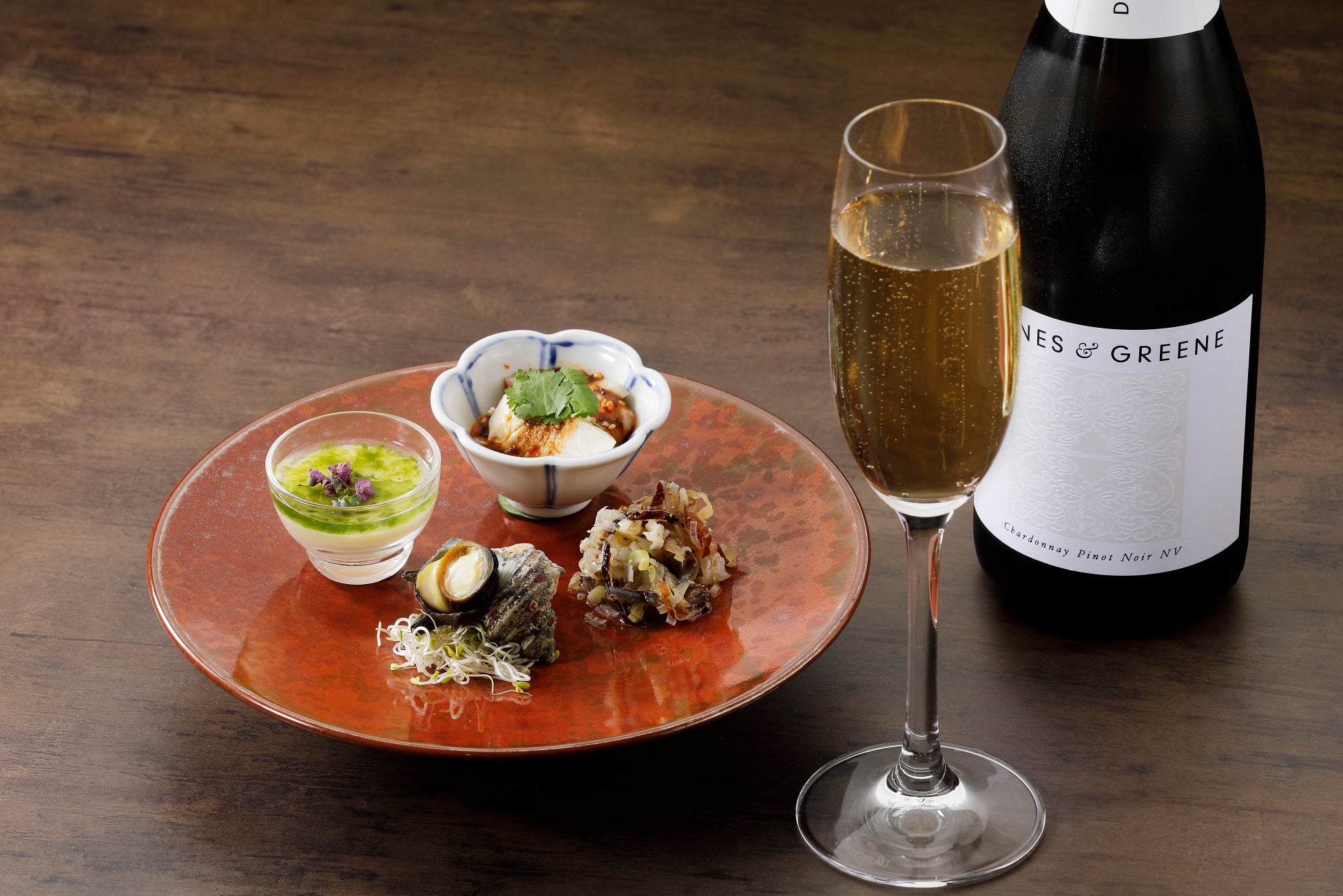 季節の食材を使った前菜と、ソムリエ厳選のスパークリングワインのセットです。