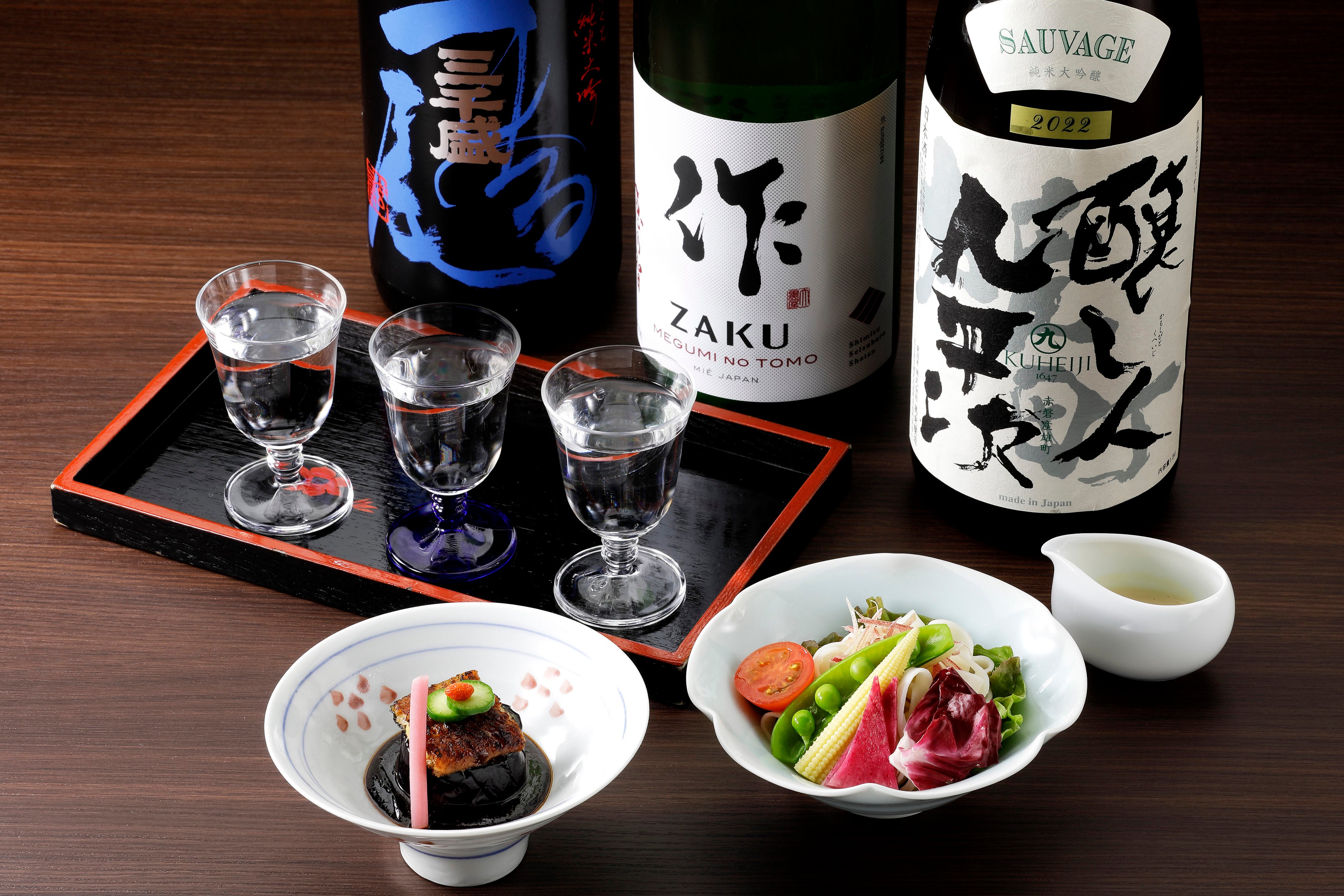 当店人気の「東海3県飲み比べセット」に、きしめんサラダや、うなぎとナスの八丁味噌田楽など日本酒にぴったりの料理を合わせました。