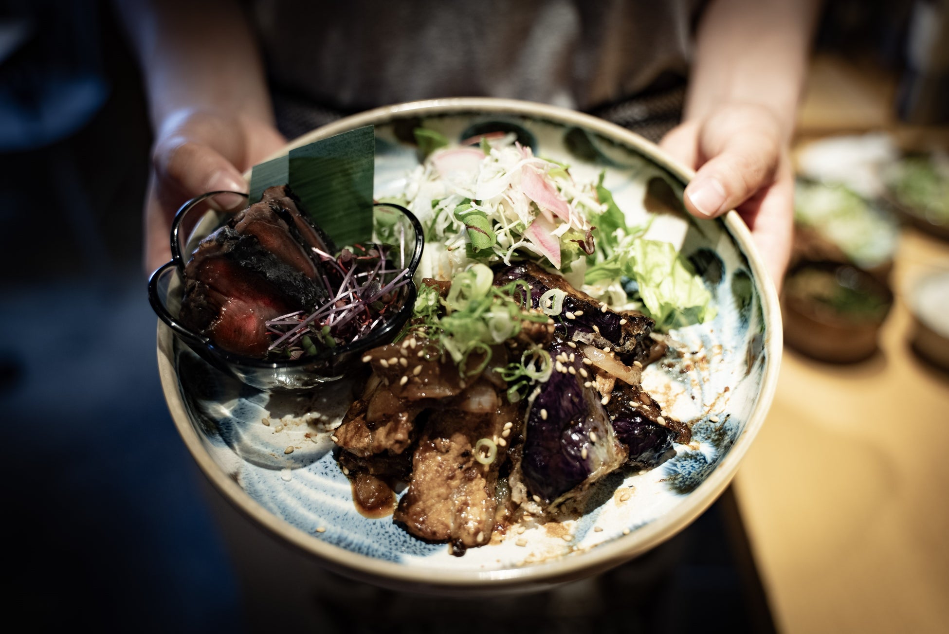 香ばしい藁焼きカツオと、旬の茄子、ジューシーな豚肉を特製味噌ダレで炒め、ごはんが進む濃厚な味わいです。