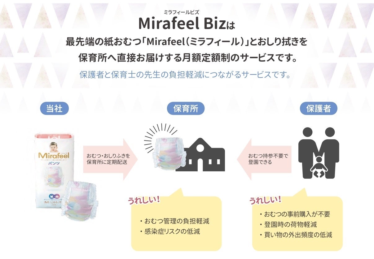 - 高品質とSNSで話題の国産紙おむつ「Mirafeel(ミラフィール)」を保育施設へお届けします。