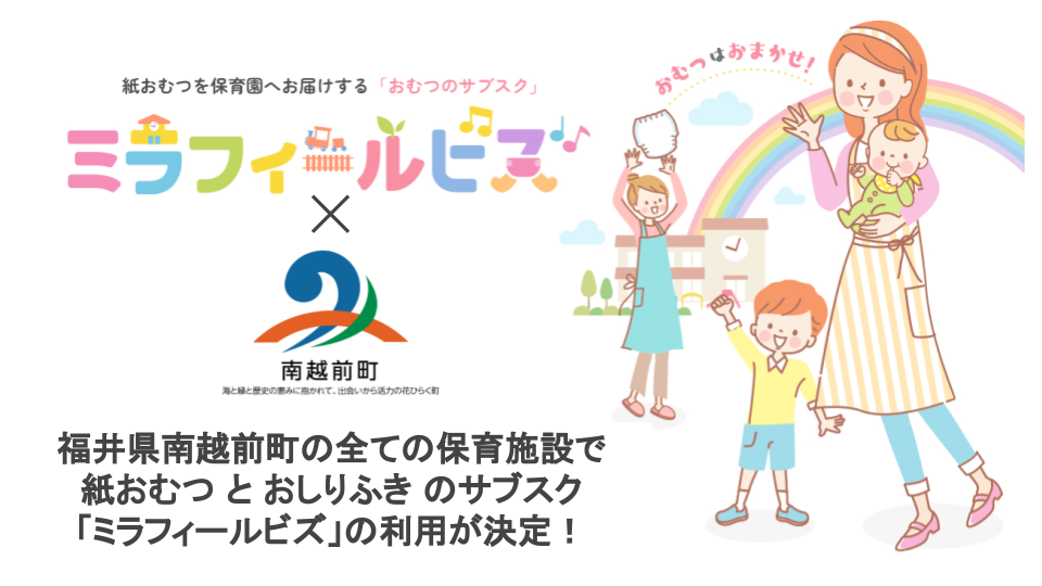 福井県南越前町の全保育施設で高品質な紙おむつ「ミラフィール」のサブスクを2022年11月1日より本格利用開始。満3歳未満を対象に月額1,000円で施設内での紙おむつとおしり拭きが使い放題に。