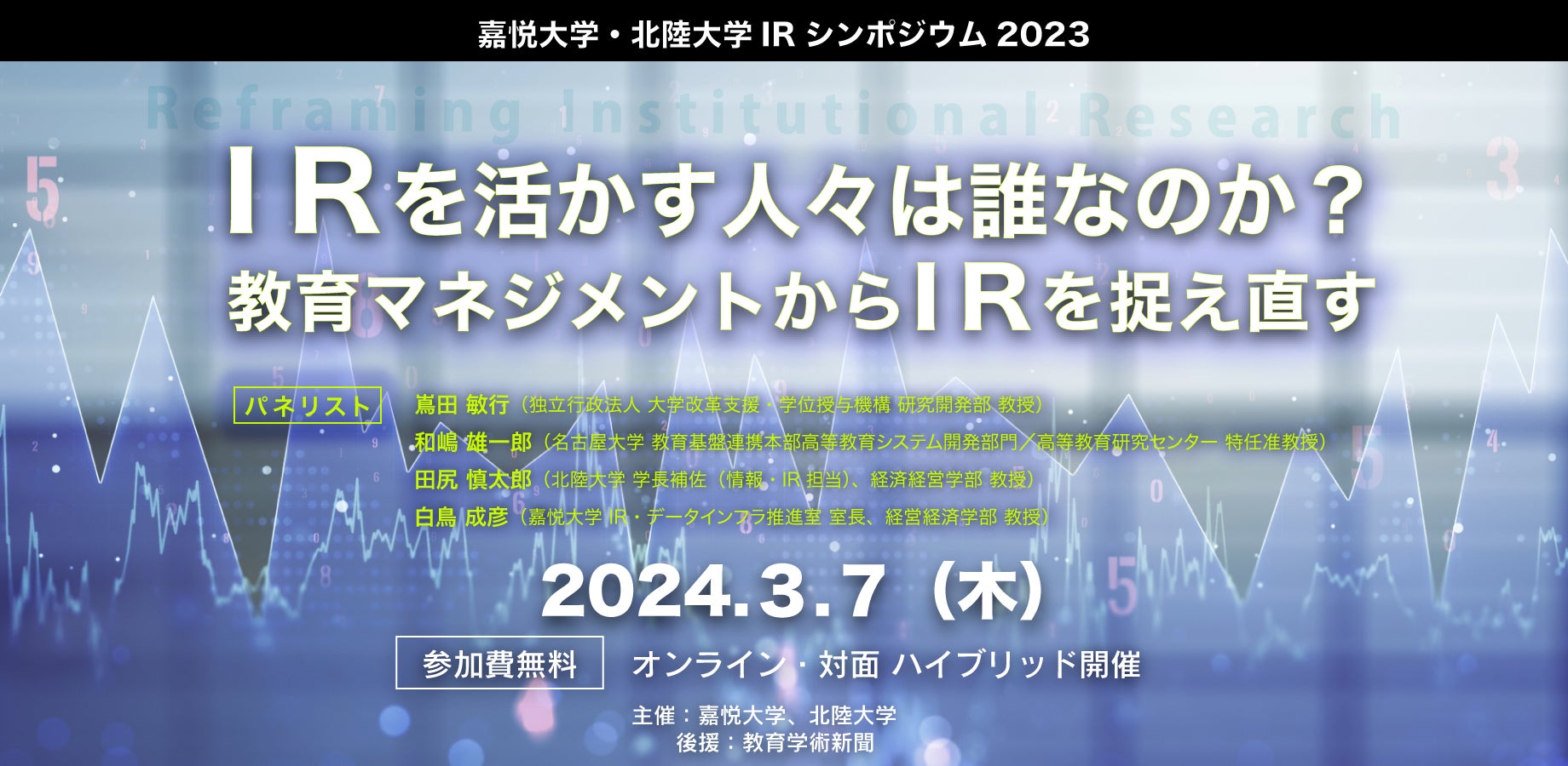 IRを活かす人々は誰なのか? 教育マネジメントからIRを捉え直す「IRシンポジウム2023」2024年3月7日(木)14:00~17:00開催