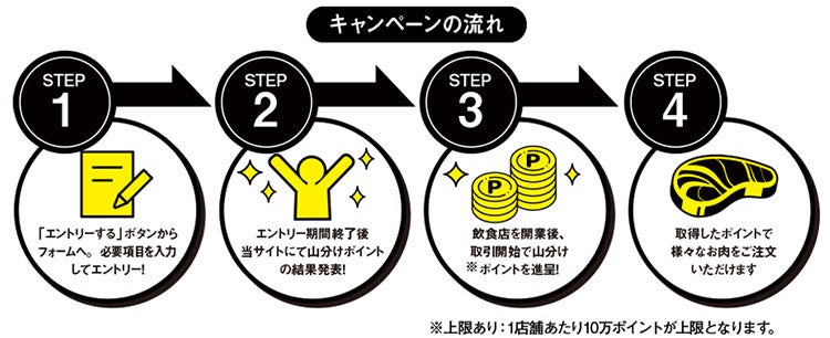 この主旨に賛同いただいた協力企業が本企画へ参画。共に飲食店開業者を支え、飲食業界がより一層活性化することを目指しています。本企画「飲食店開業を応援!総額1,000万円分 お肉を山分けキャンペーン」にエントリーすると、ポイント山分けの他に、ご希望の協力企業によるお得なサービス特典も受けることができます。協力企業の力強い応援が、さらに飲食店開業をサポートします。