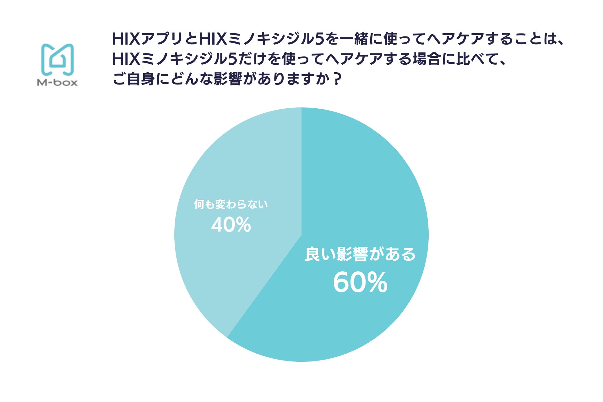そして今回、実際にHIXユーザーへヒアリング調査を実施したところ、60%の方が「HIXアプリとHIXミノキシジル5を一緒に使うと、良い影響がある」と回答しており、HIXアプリによるヘアチェックと医薬品を併用いただくことで、高い満足度に繋がっていることがうかがえます。