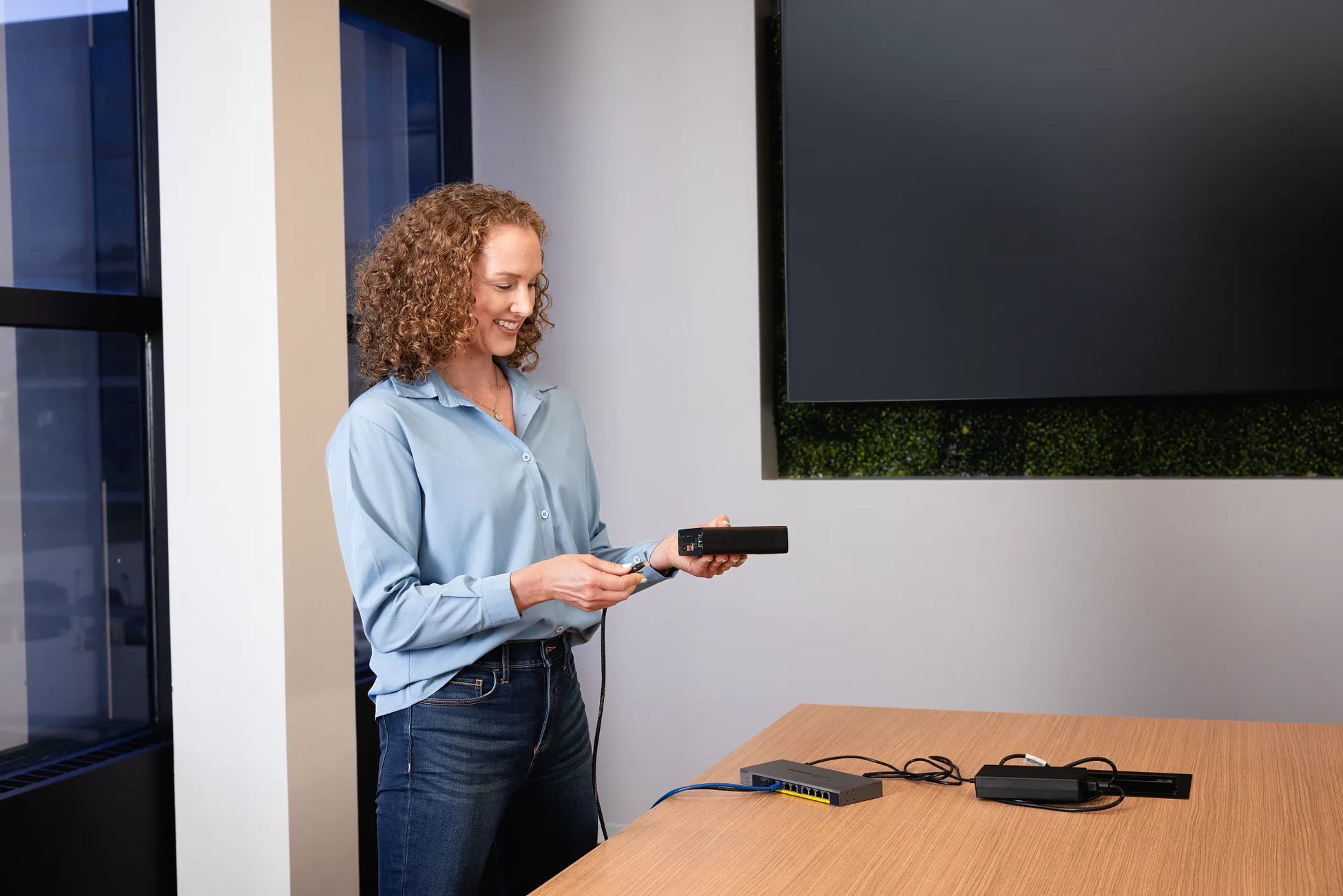 オーディオ・カンファレンスキットは、天井設置型マイクロホンの柔軟性と安定した音声品質が求められる中小規模会議室向けのネットワークソリューションです。MXA902には、高性能アレイマイクロホンと広拡散スピーカーが内蔵され、自然なスピーチ音声の収音と出力を実現します。さらに、内蔵IntelliMix® DSPがノイズやエコーを抑制して高品質な会議音声を提供するため、別途オーディオプロセッサーを用意する必要もありません。一方、ANIUSB-MATRIXインターフェースは、ネットワークデバイスであるMXA902と会議室常設PCやBYOD(持ち込みデバイス)とのUSB接続を可能とし、任意の会議プラットフォームと簡単に接続して使用できます。