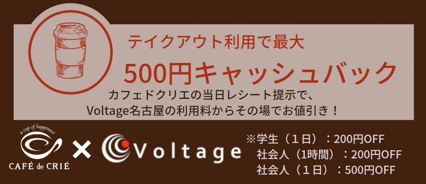 利用方法:カフェ・ド・クリエの当日レシートと商品を提示していただいた方限定で、Voltage名古屋の利用費から最大500円キャッシュバックいたします。