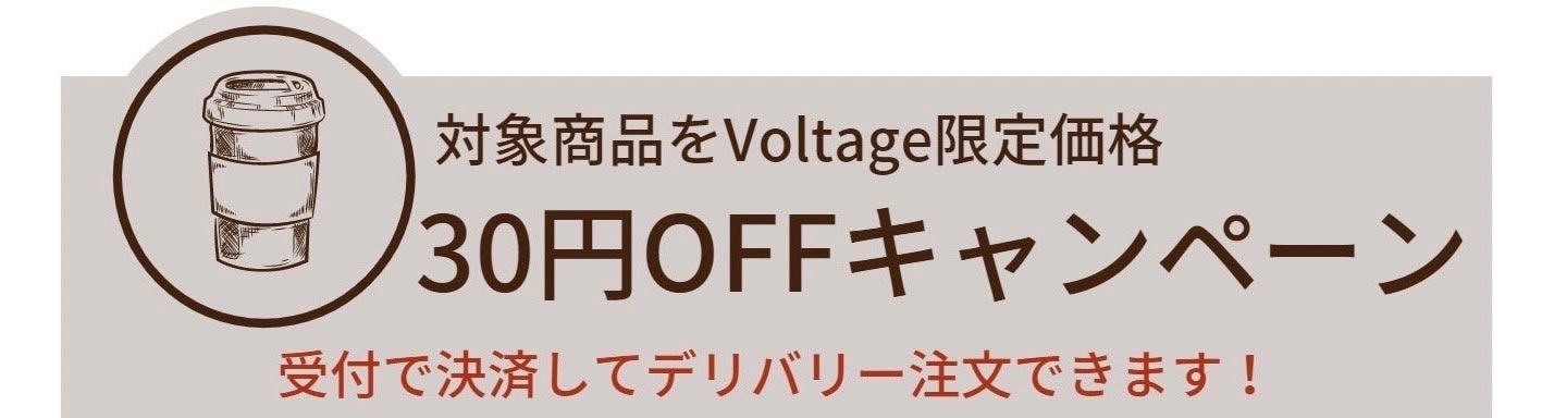 ①Voltage名古屋の店内からカフェ・ド・クリエの商品を30円引きでデリバリー注文できるようになります。
