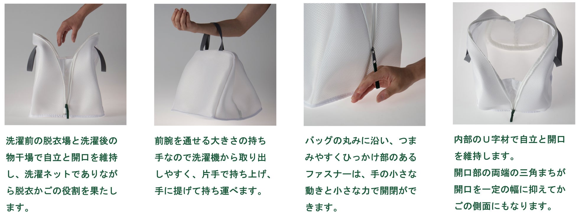 「洗濯ネットバッグ」は、洗濯用ネットと脱衣かごが一体化したバッグ型の洗濯支援ツールです。脳卒中による片麻痺、リウマチ、肩の傷病等で、指・手・肩関節の可動に制限がある方々が、脱衣かごへ服を入れる、洗濯用ネットへ服を移す、ネットを洗濯機に入れる、洗濯後に服を取り出す、干し場まで運ぶといった洗濯に伴う一連の作業を一つのバッグで円滑に実現することができます。バッグの丸みに沿うつまみやすいファスナーは無理なく開閉が可能です。痛く、疲れる洗濯を前向きな営みに変えます。