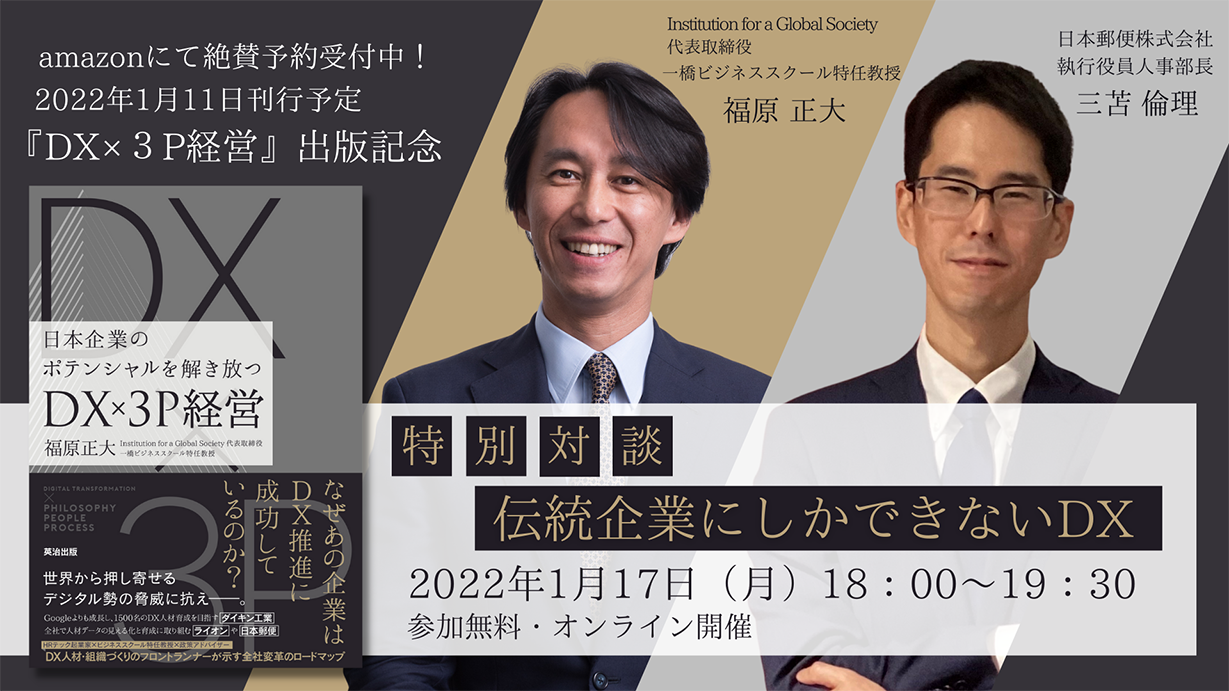 また、本書の出版を記念して、日本郵便株式会社 執行役員人事部長 三苫倫理氏と、代表福原による特別対談イベント「伝統企業にしかできないDX」を、2022年1月17日(月)18:00-19:30に、オンラインで開催いたします。参加費は無料です。DX推進にご関心のある経営者、DX推進担当者、人事担当者の方々や、DX人材・組織づくりにご関心のある方々のご参加をお待ちしております。