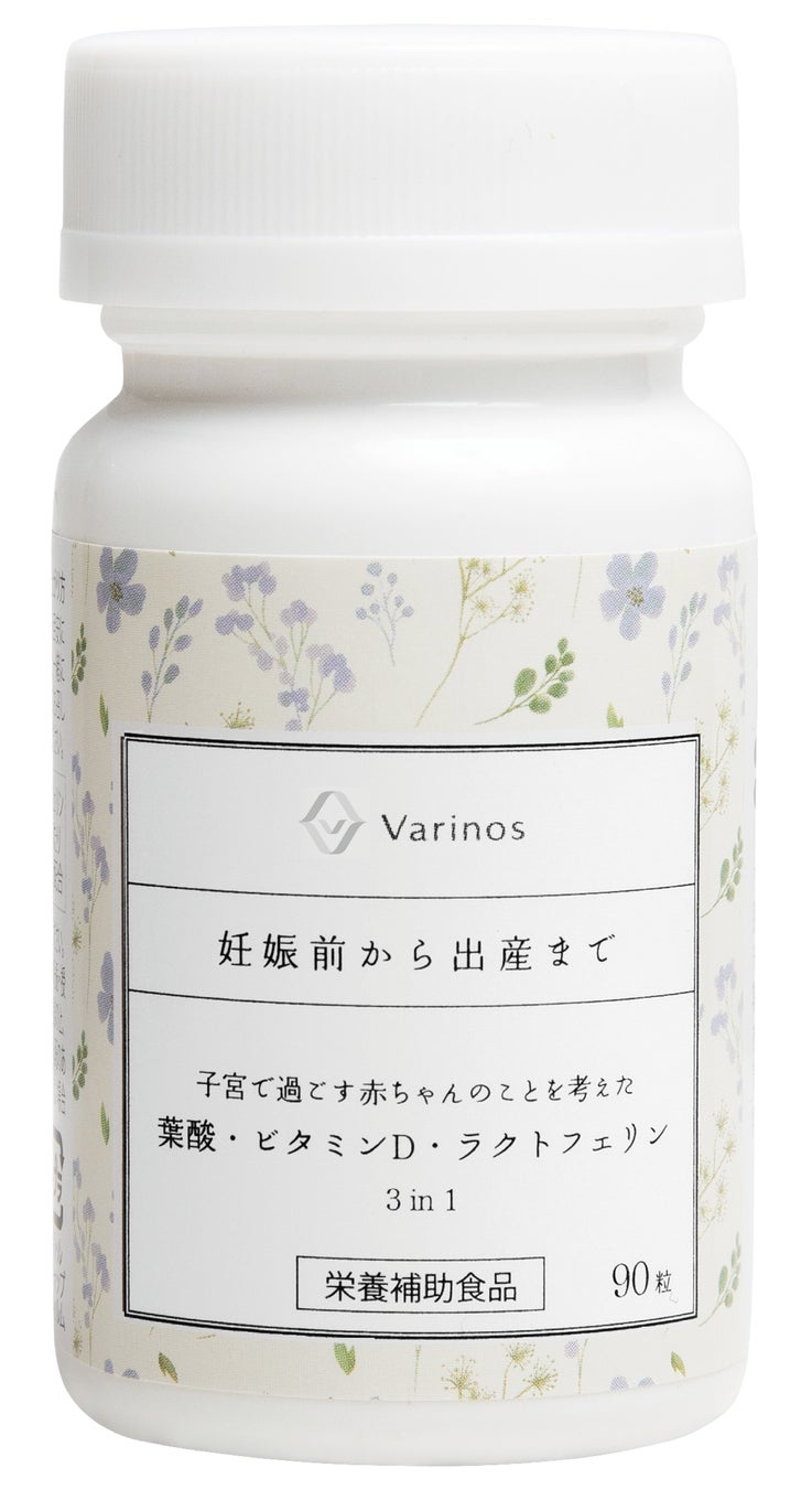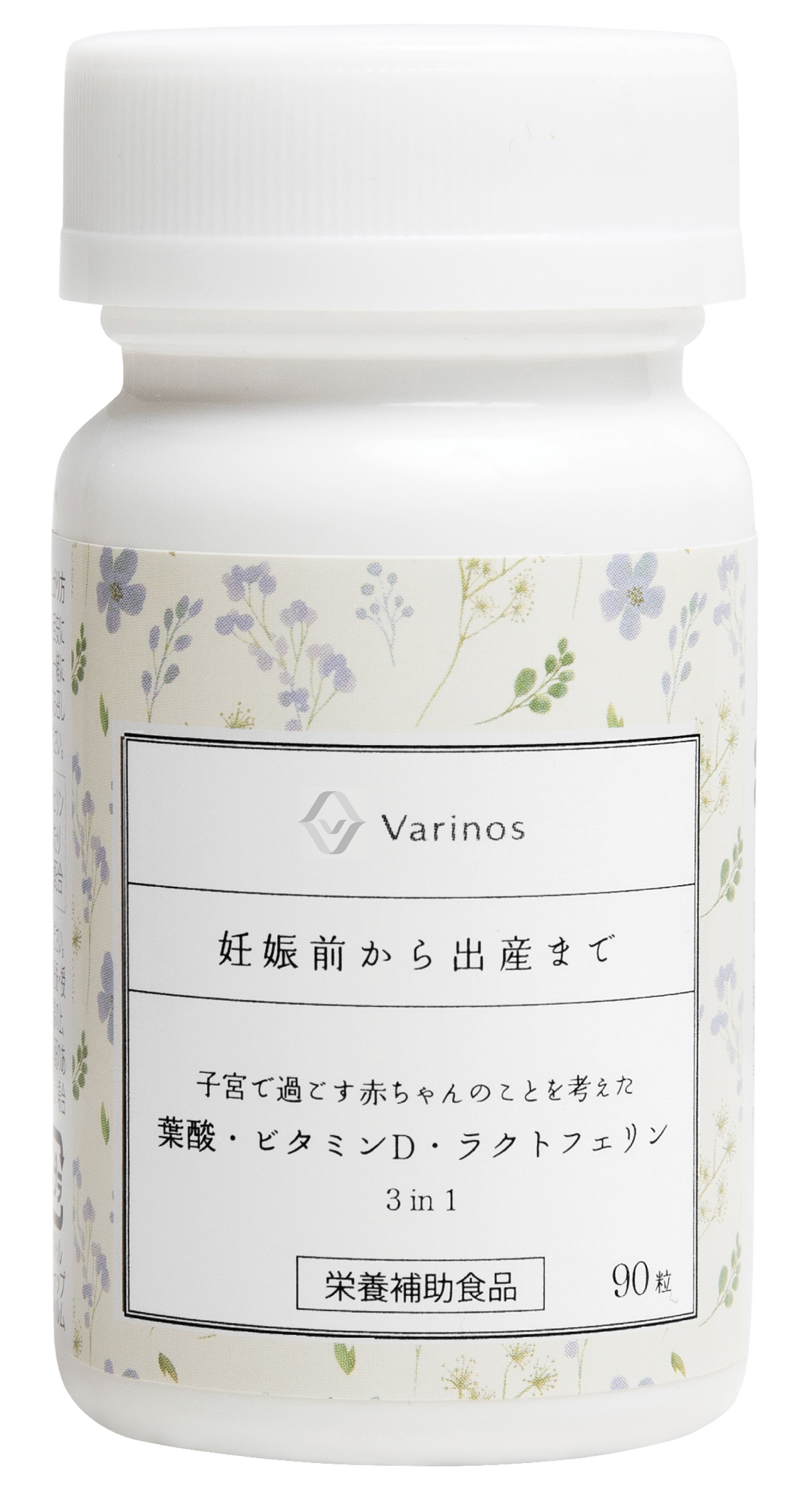 「子宮で過ごす赤ちゃんのことを考えた 葉酸・ビタミンD・ラクトフェリン」は、妊娠前から出産まで補ってほしい、Varinosが厳選した3つの栄養素をお届けするサプリメントです。