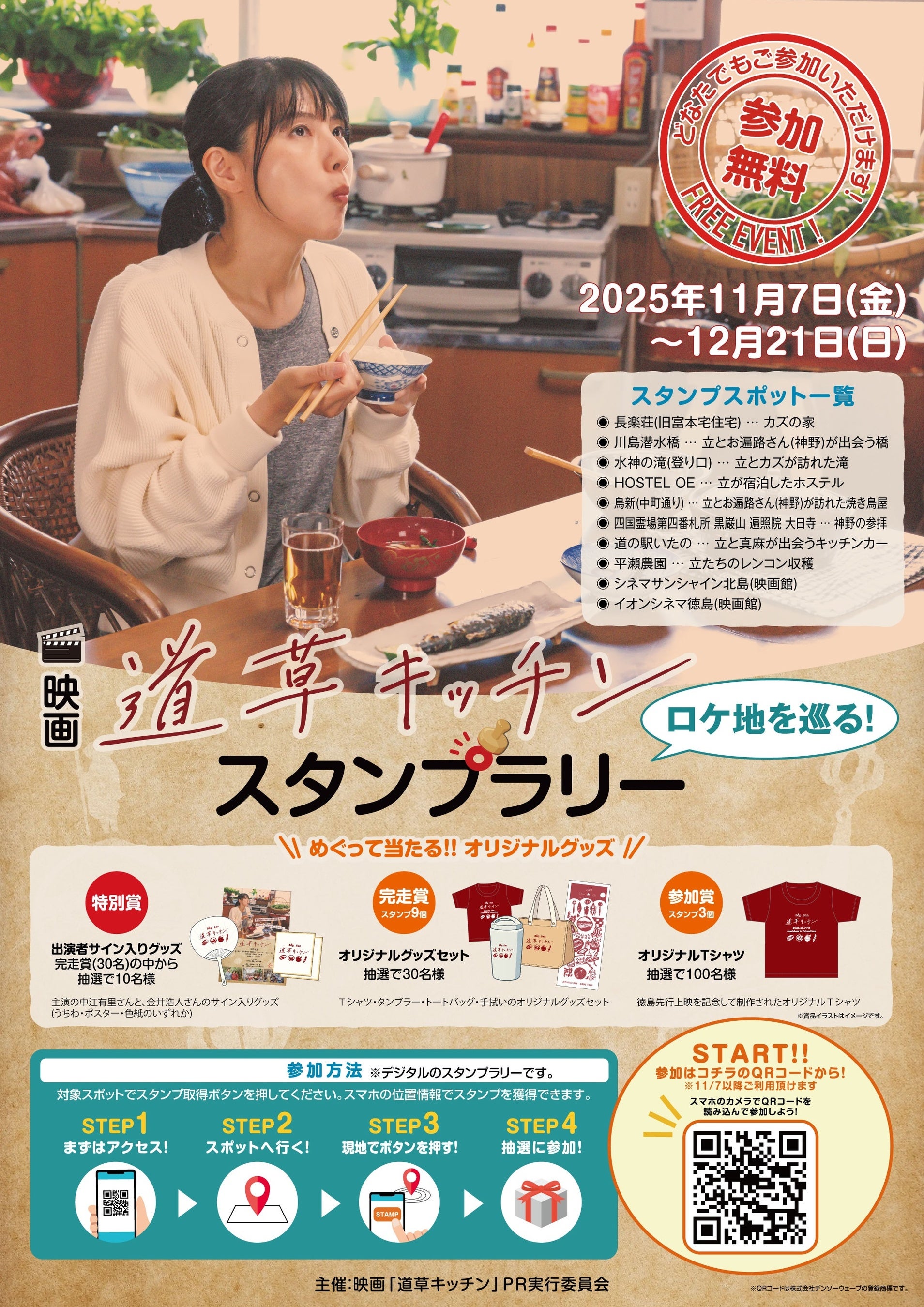 映画『道草キッチン』は、徳島県を舞台に「食と人のつながり」を描いた作品。本スタンプラリーでは、映画に登場するロケ地やゆかりのスポットを巡り、映画の世界観を体感しながら、地域の自然や文化、グルメなどの魅力に触れることができます。スマートフォンから無料で参加でき、どなたでも気軽に楽しめます。