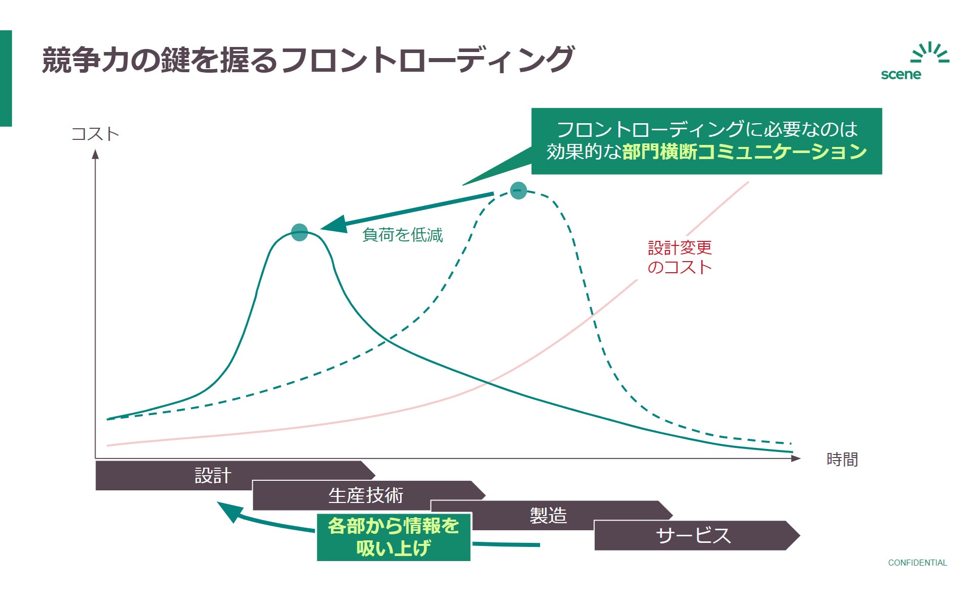 『品質・コストの8割は設計で決まる』と言われる中、多くの企業がフロントローディングの実現による問題点の早期発見、品質向上、後工程での手戻りを減らすために努力しています。特に、設計とその他の部門間のコミュニケーションは重要であり、コンカレントエンジニアリングへの取り組みも注目されています。しかし、7割の企業が組織間コミュニケーションに課題を抱えている現状です。
