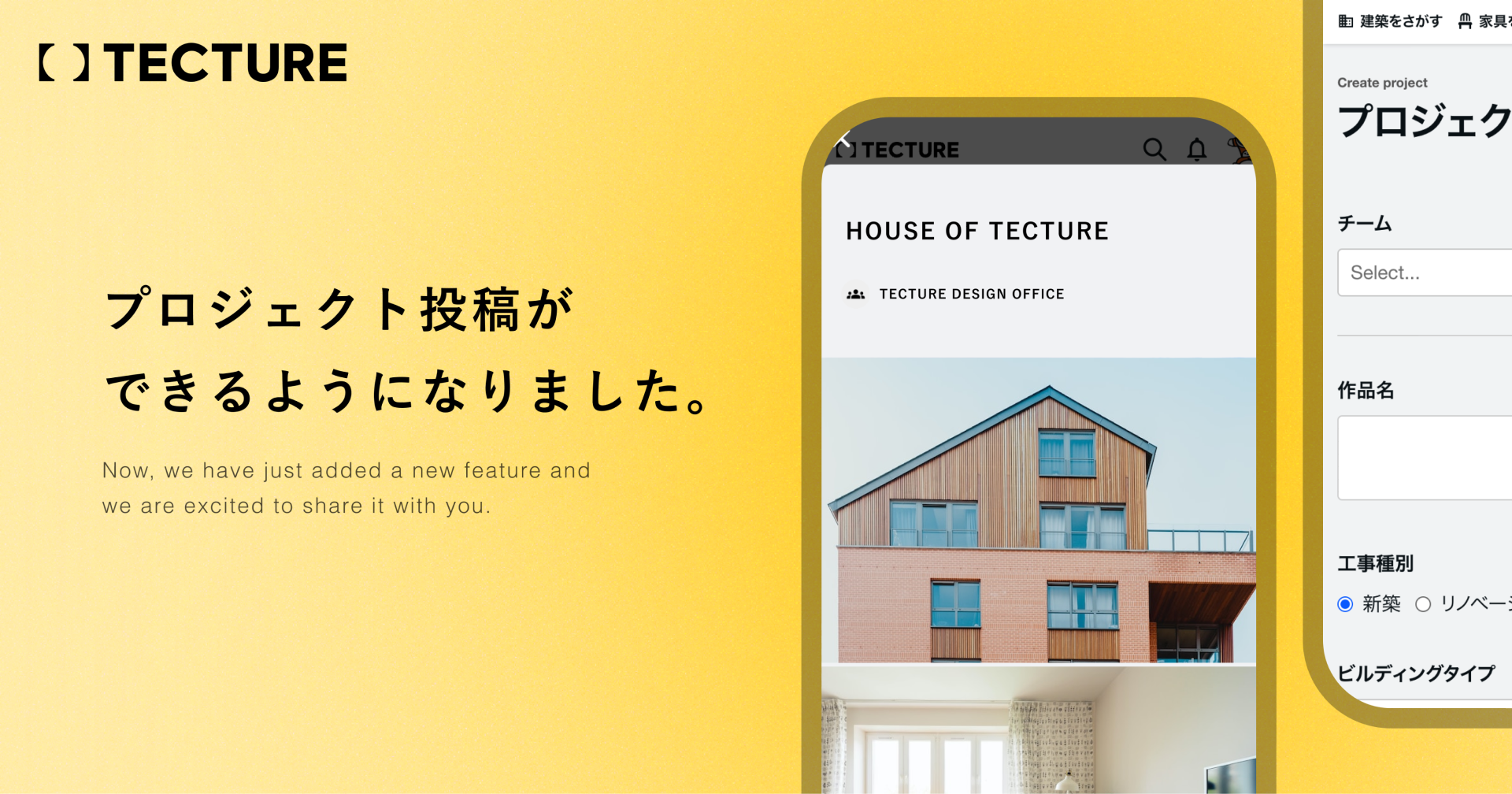 建築デザイン領域のDX化を目指すtecture株式会社(以下、tectureと小文字で略)は、2020年6月にローンチし、インターネット上で運営している建材・家具検索プラットフォーム「TECTURE」のサービスを拡充し、新たに"プロジェクト投稿機能"を追加で実装しました。