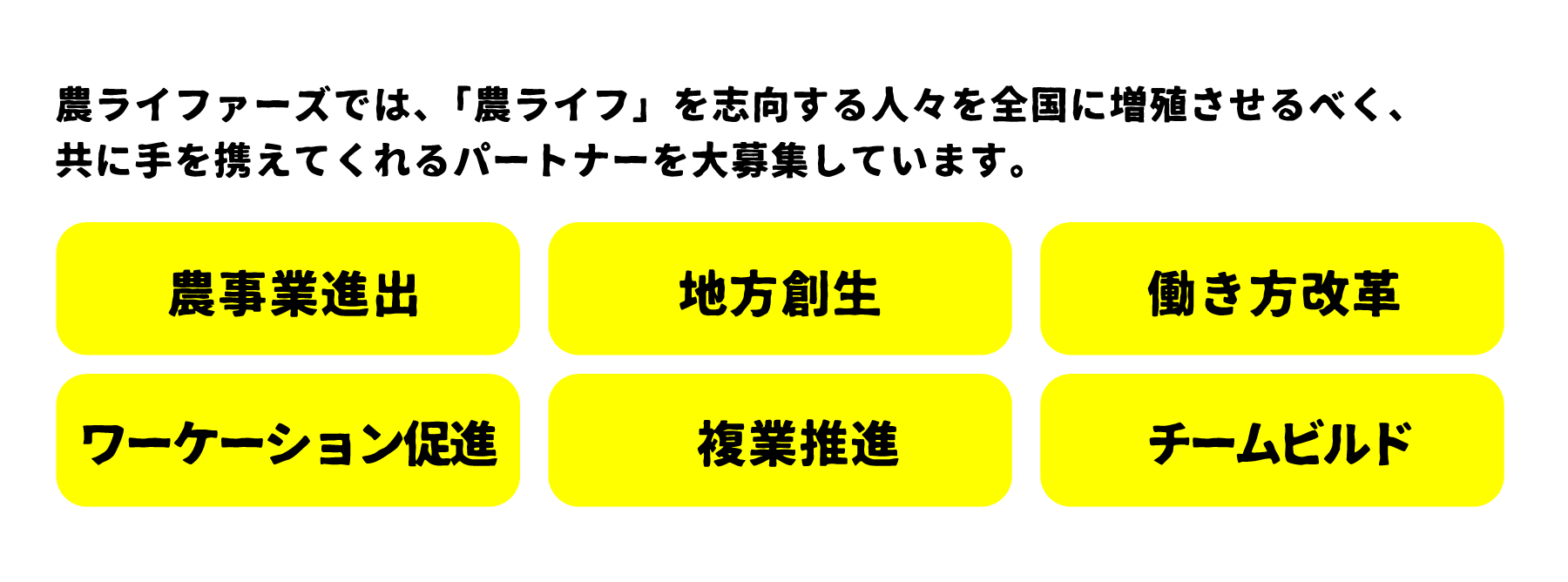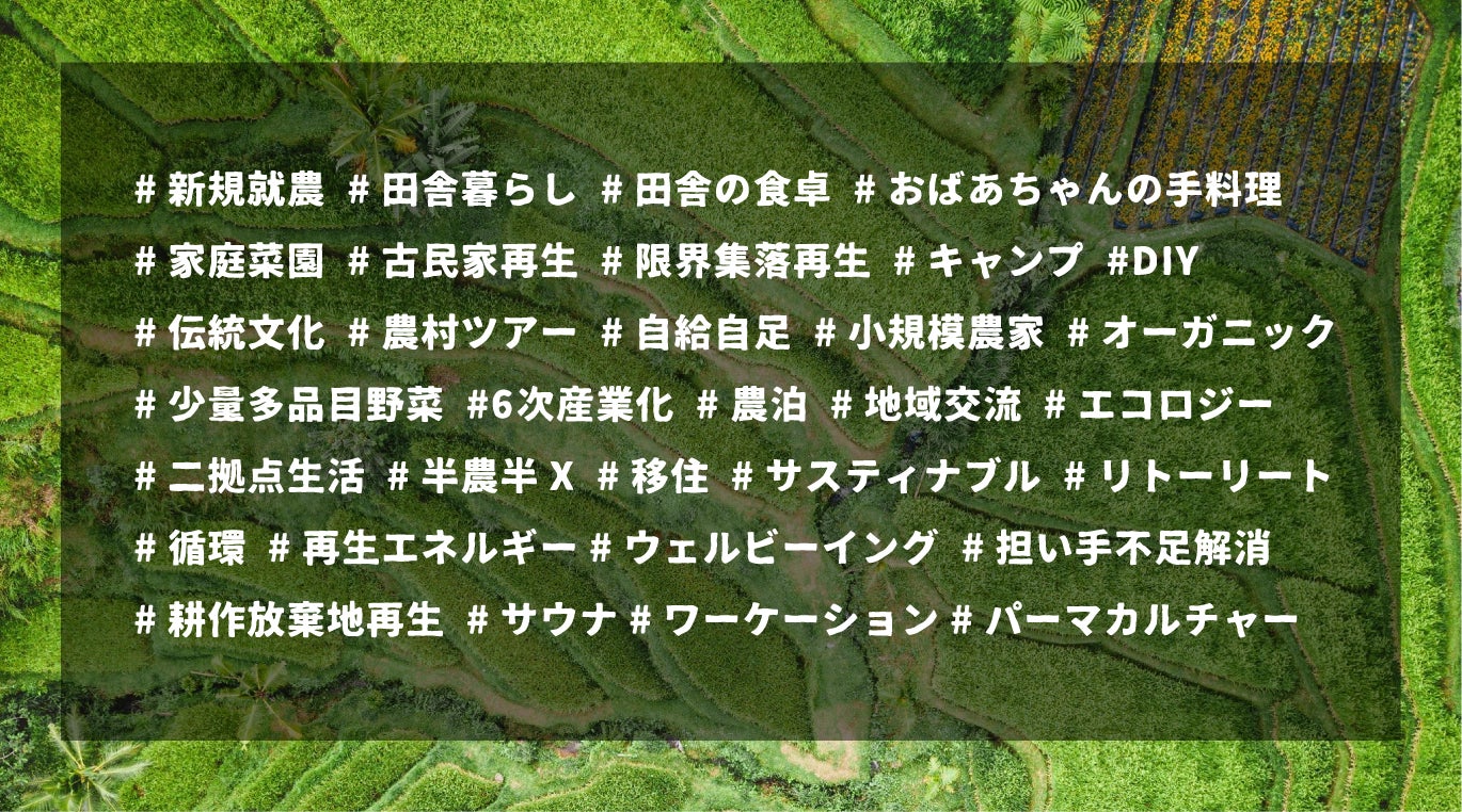 農ライフとは、「自然と共にある暮らし」。都会にいても田舎にいても、「暮らし」と「商い」どちらも耕すようなウェルビーイングな生き方ができると考えています。「農ライフ」を人生の一つの選択肢として、社会のスタンダードにしたい。