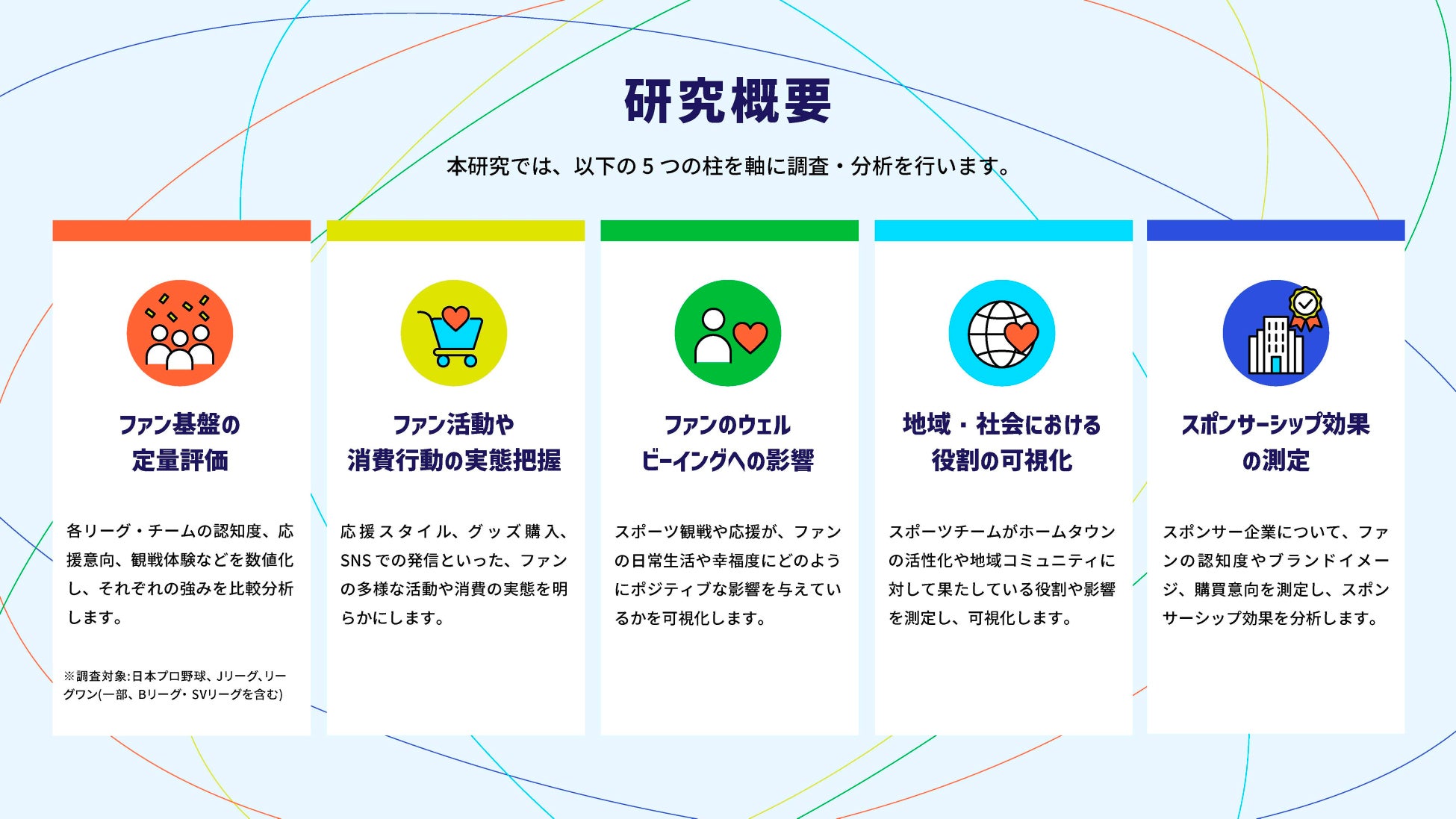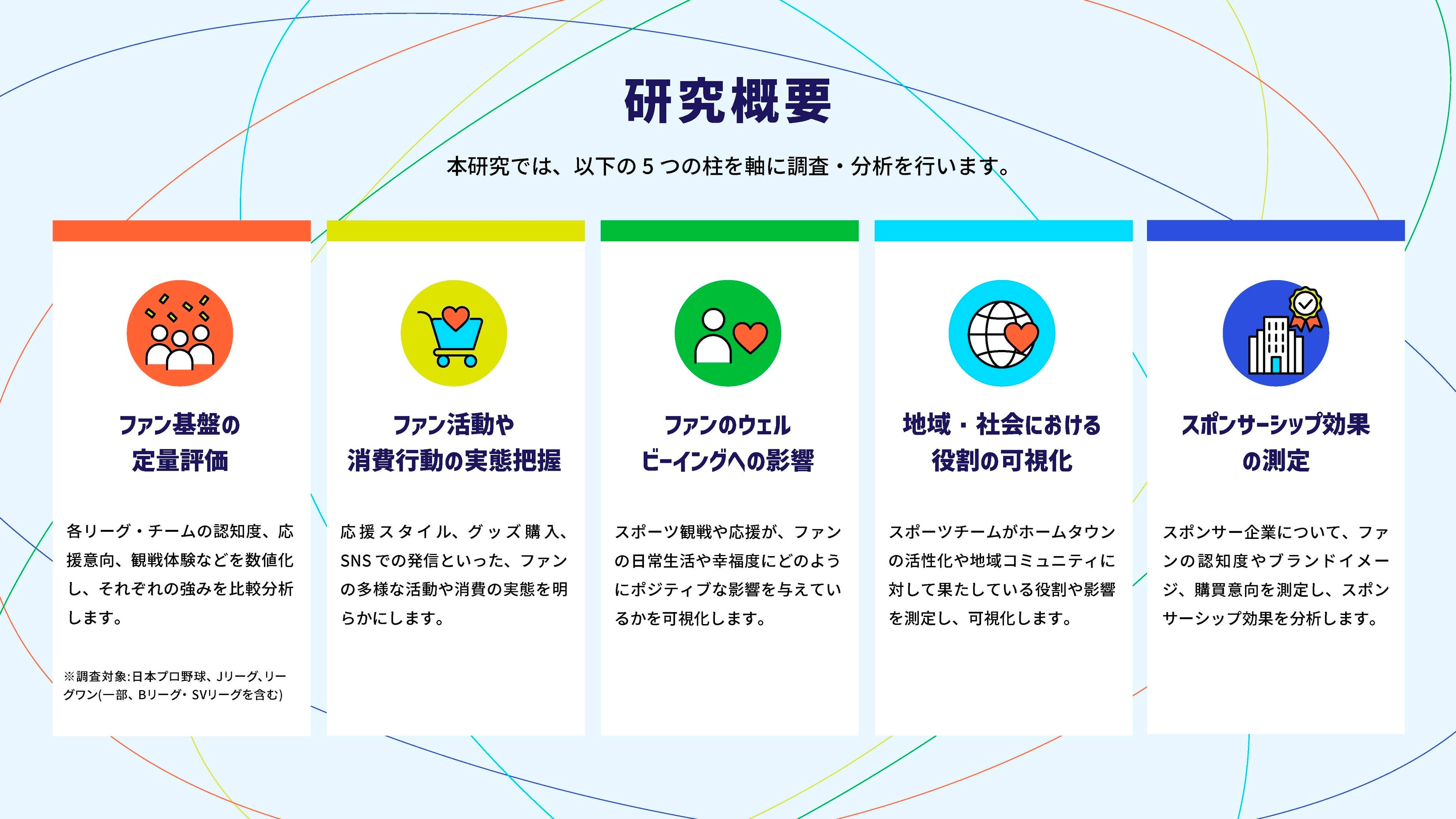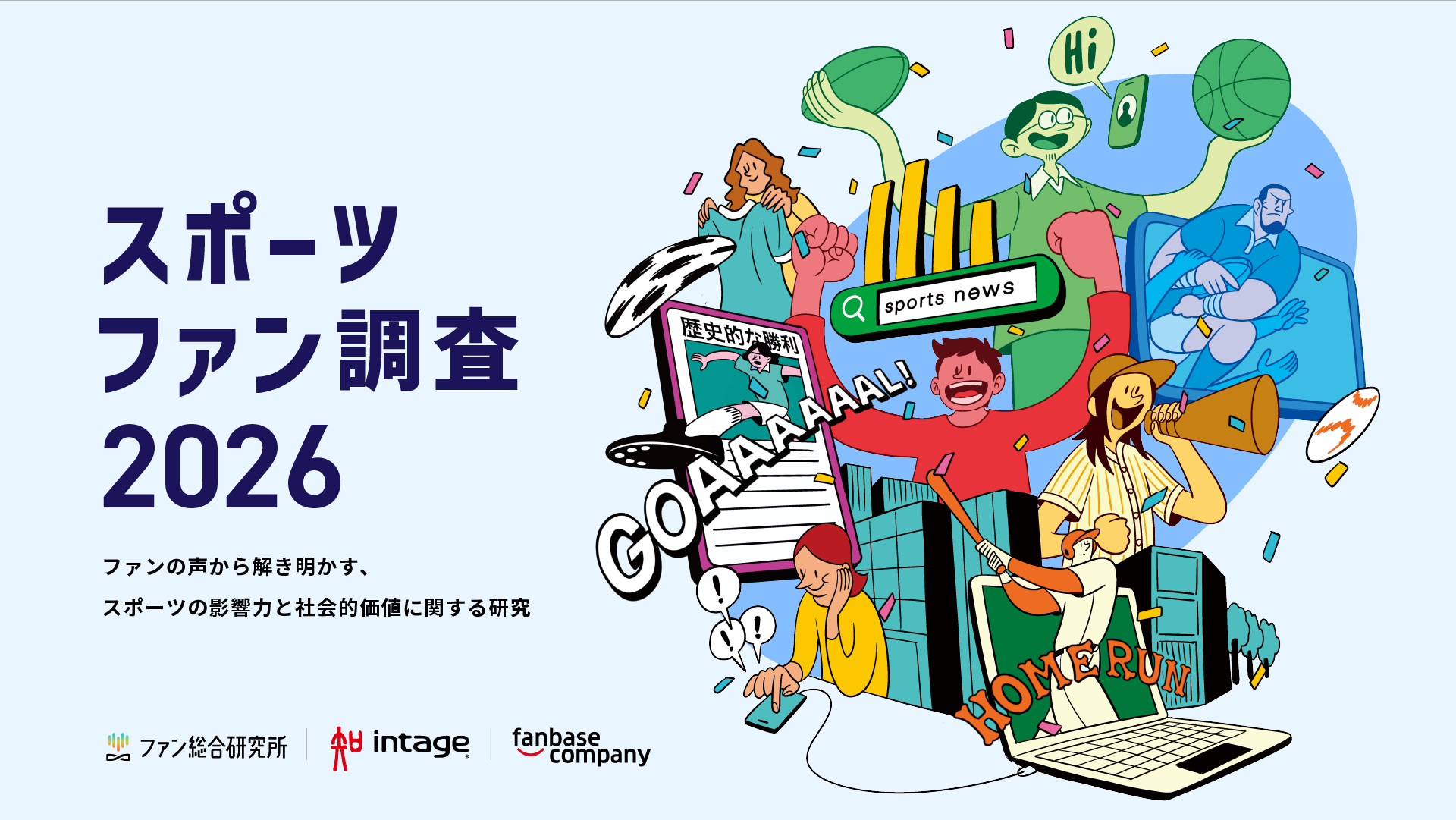 本研究は、業界最大規模のリサーチ基盤を保有する株式会社インテージ(本社:東京都千代田区)と協業し、同社の信頼性の高いデータ収集・調査ノウハウと、ファン総合研究所が持つファン心理の分析ノウハウを掛け合わせることで、スポーツの影響力と価値を定量的に可視化するものです。