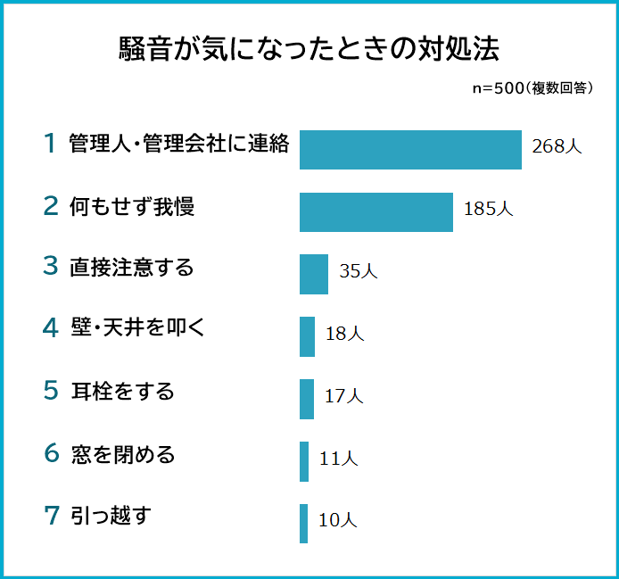 続いて「騒音が気になったときの対処法」を聞いたところ、1位は「管理人・管理会社に連絡(268人)」でした。