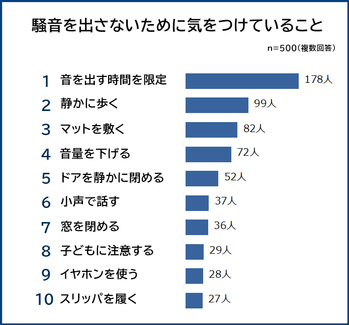 2位「静かに歩く(99人)」、3位「マットを敷く(82人)」、4位「音量を下げる(72人)」、5位「ドアを静かに閉める(52人)」と続きます。