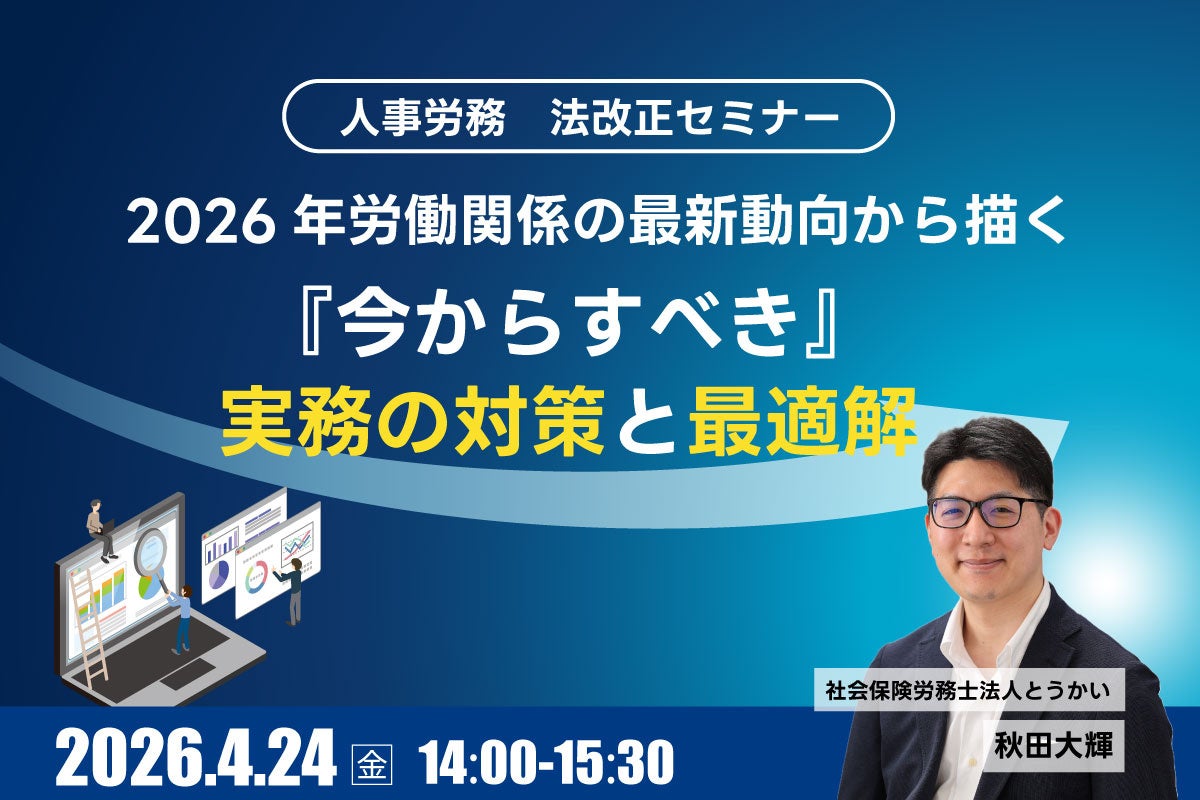社会保険労務士法人とうかい(所在地:愛知県名古屋市、代表:久野勝也)は、2026年4月24日(金)に、人事労務担当者および経営者を対象とした無料オンラインセミナー『2026年労働関係の最新動向から描く「今からすべき」実務の対策と最適解』を開催いたします。